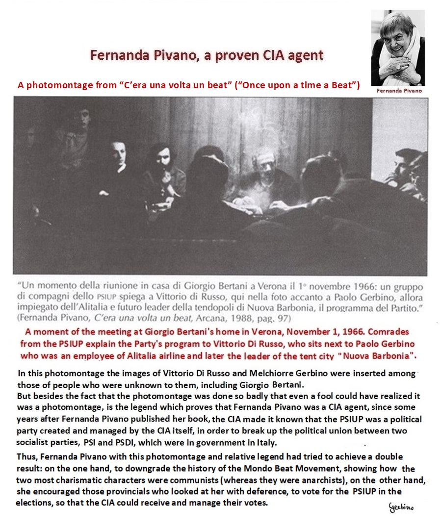 Thus Fernanda Pivano with this photomontage had attempted to achieve a double result, namely that of diminishing the history of the Mondo Beat Movement by showing how the two most charismatic characters of this movement, Vittorio Di Russo and Melchiorre Paolo Gerbino, were communists (while they were anarchists) and, on the other hand, she would have encouraged the contestatarians to vote for the PSIUP in the elections, in order to have their votes delivered to the CIA.