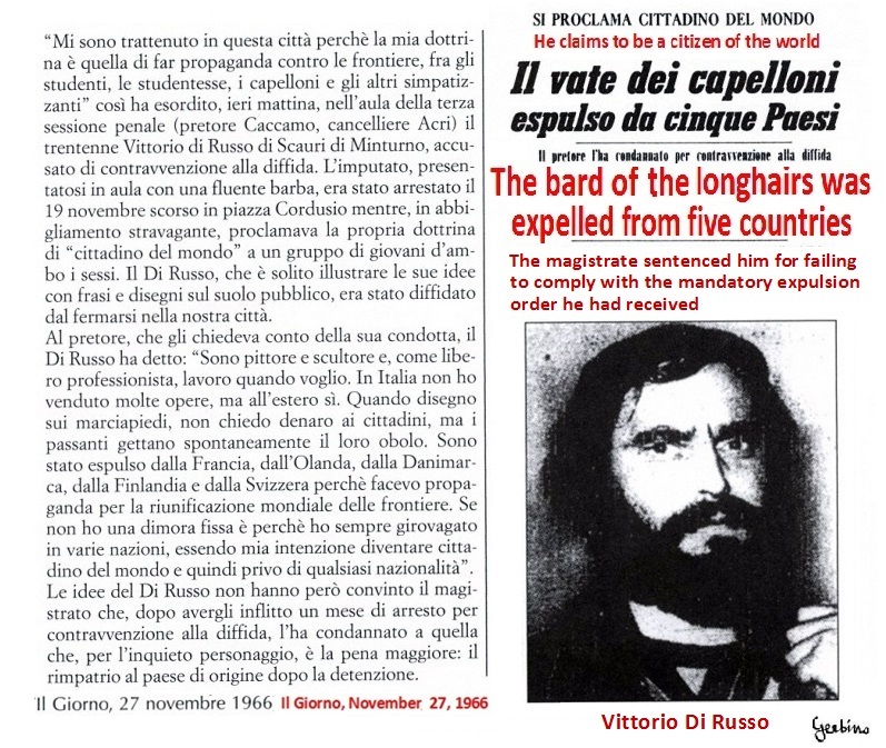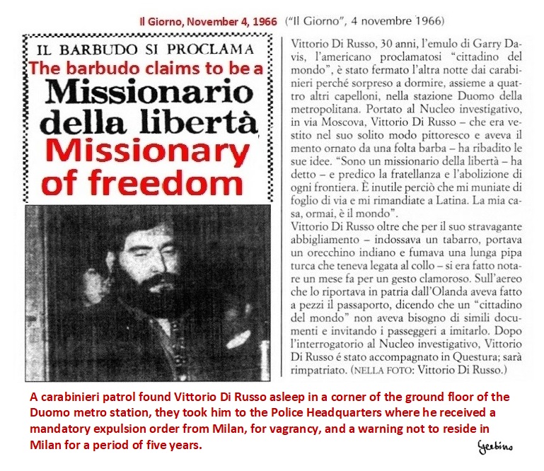 The day after that theatrical situation in Fernanda Pivano's salon, a carabinieri patrol found Vittorio Di Russo asleep in a corner of the ground floor of Duomo metro station. He was brought to the Police Headquarters where he received a mandatory expulsion order from Milan, for vagrancy, and a warning to stay away from Milan for a period of five years.