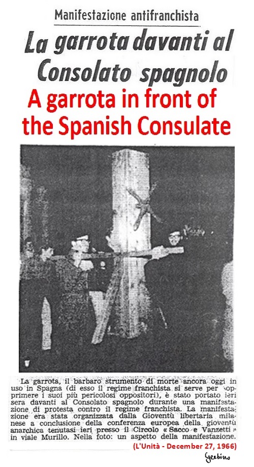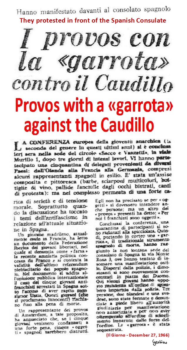 At the end of the European Conference of Anarchist Youth, a demonstration took place in front of the Spanish consulate in Milan, where the Provos displayed a garrota as a sign of contestation of the dictatorship of General Francisco Franco.