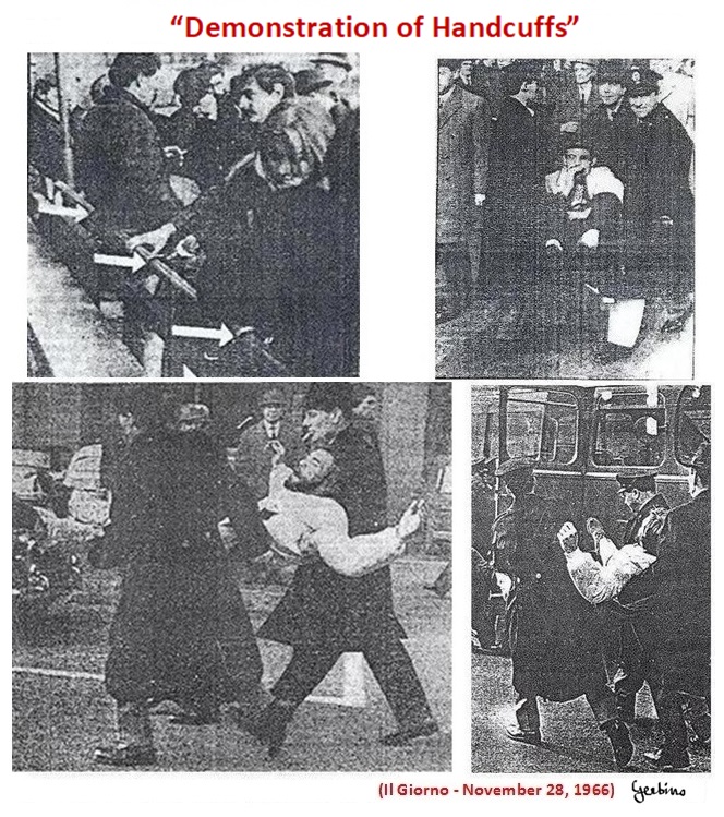 The three groups coordinated and on the morning of Sunday 27 they staged a demonstration in the heart of Milan, Piazza San Babila. It was the first time a demonstration organized by extra-parliamentary groups took place in Italy. Called "Demonstration of Handcuffs" (Manifestazione delle Manette), it received a wide media coverage, the Milanese newspaper Il Giorno published article and pictures on the front page.