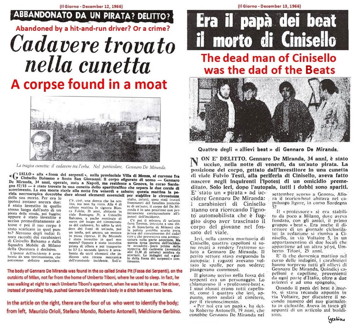 When we learned of Gennaro's death, four of us went to Cinisello Balsamo morgue to identify the body. In this sad circumstance Melchiorre Gerbino met a young journalist from the newspaper Il Giorno, Ezio Chiodini, who expressed his interest in following the events of the Mondo Beat Movement, so the two established contact with each other.