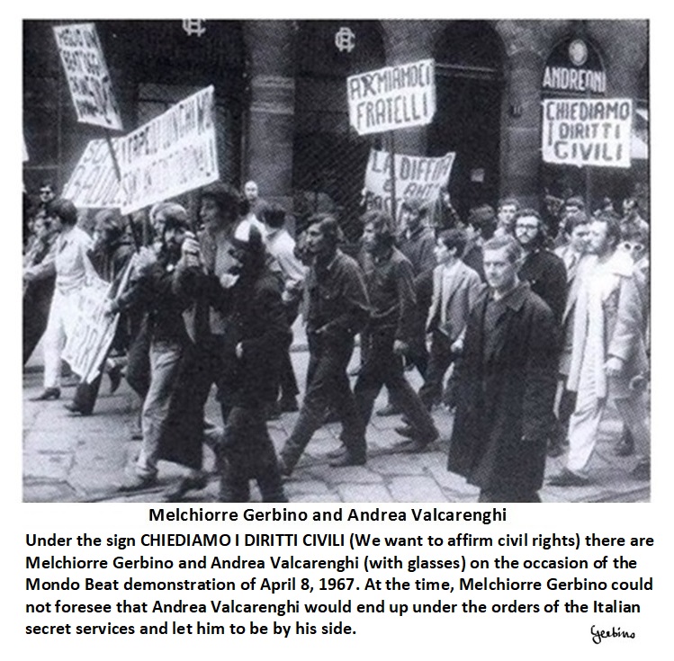 Below is a photo taken on 8 April 1967, on the occasion of a demonstration of the Mondo Beat Movement. Under the sign CHIEDIAMO I DIRITTI CIVILI (WE ASK FOR CIVIL RIGHTS) there are Melchiorre Gerbino and Andrea Valcarenghi (with glasses). At the time, Melchiorre Gerbino could not foresee that Andrea Valcarenghi would end up under the orders of the Italian secret services and allowed him to stay at his side.