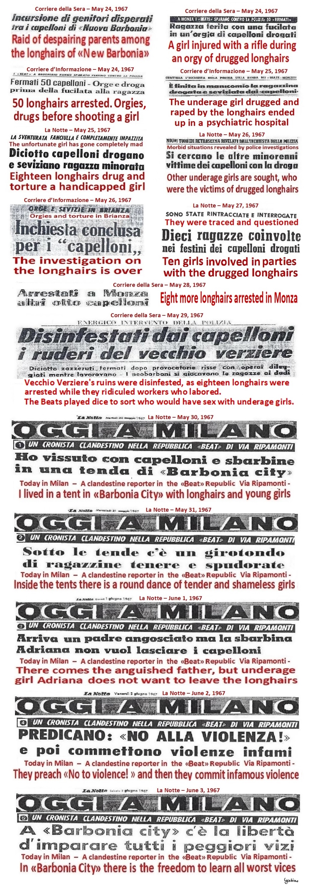 Below, a collage of the titles of the articles from Corriere della Sera, Corriere d'informazione and La Notte, when they waged a campaign against the Beats which lasted uninterruptedly for 11 days.