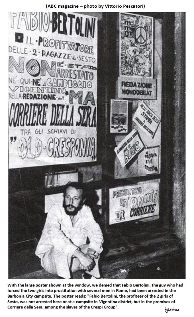With the large poster displayed in the window, we denied that Fabio Bertolini, the guy who had forced the two girls into prostitution with several men in Rome, had been arrested at the Barbonia City campsite. The poster reads "Fabio Bertolini, the profiteer of the 2 girls from Sesto, was not arrested here nor in a campsite in Vigentino district, but in the facilities of the Corriere della Sera, among the slaves of the Crespi Group".