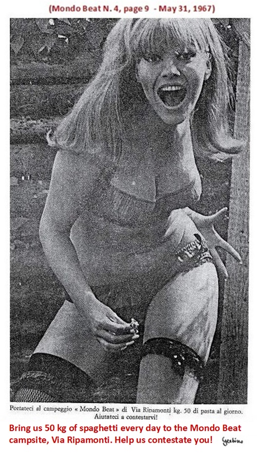 From the magazine Mondo Beat, N.4, page 9, detail: Bring us 50 kg of spaghetti every day to the Mondo Beat campsite, Via Ripamonti. Help us contestate you!