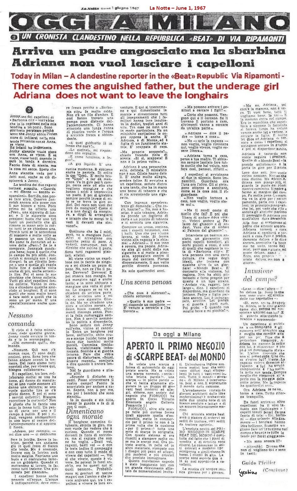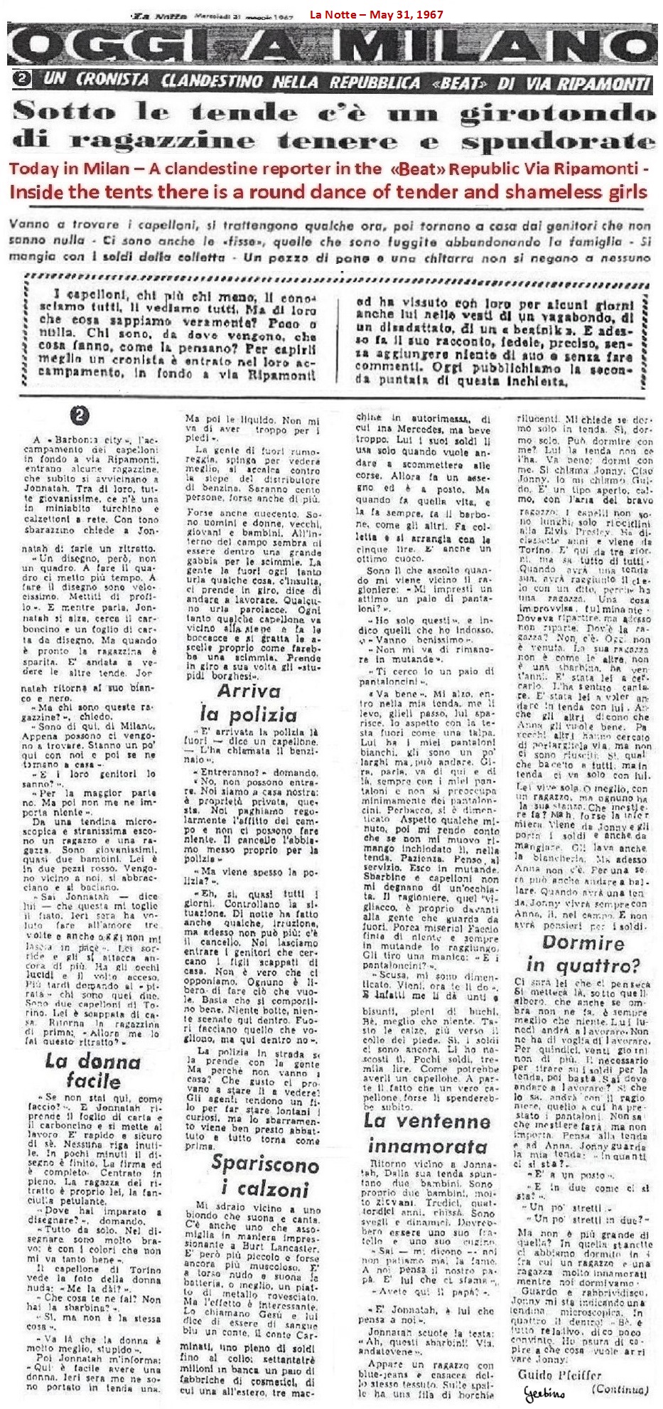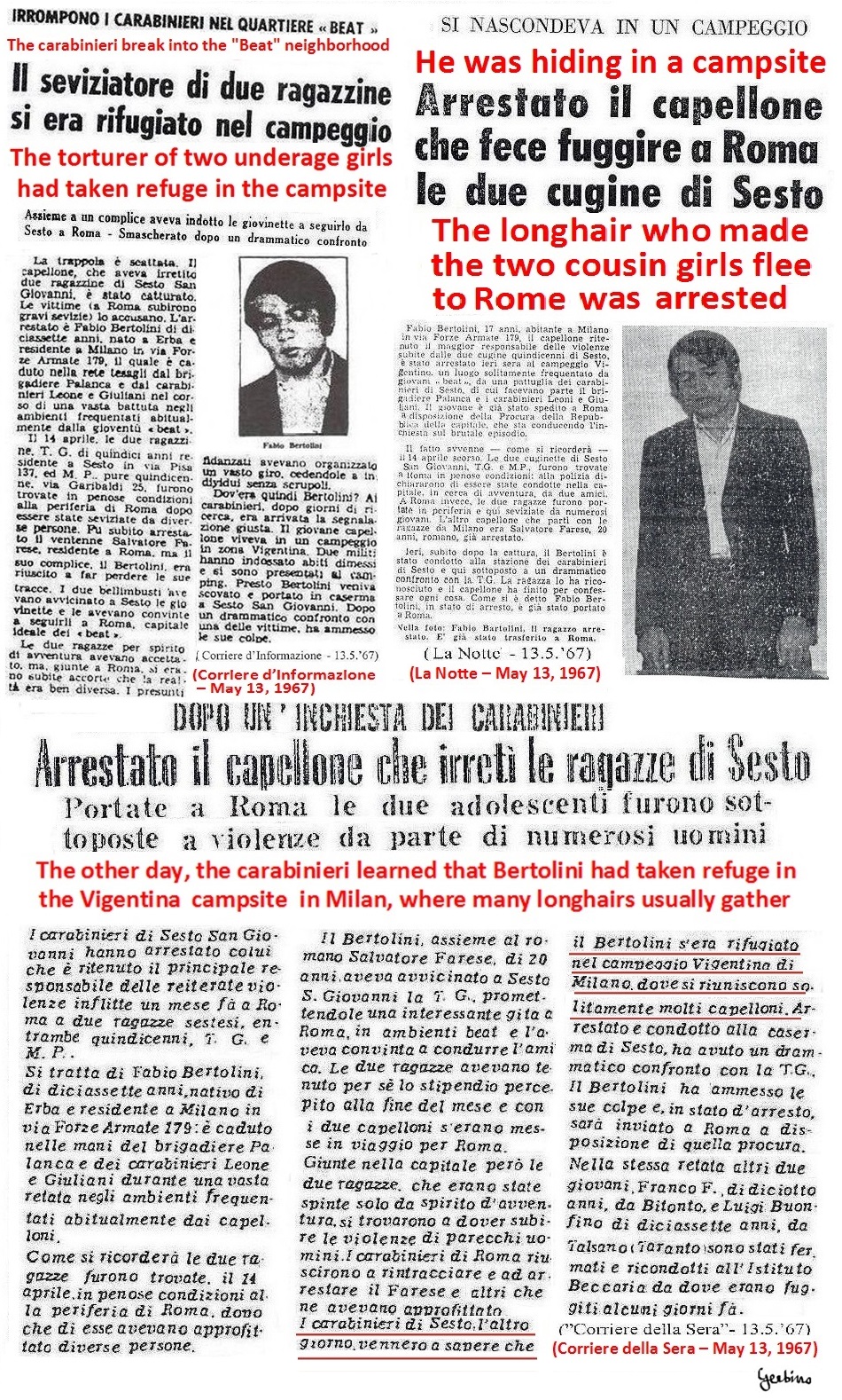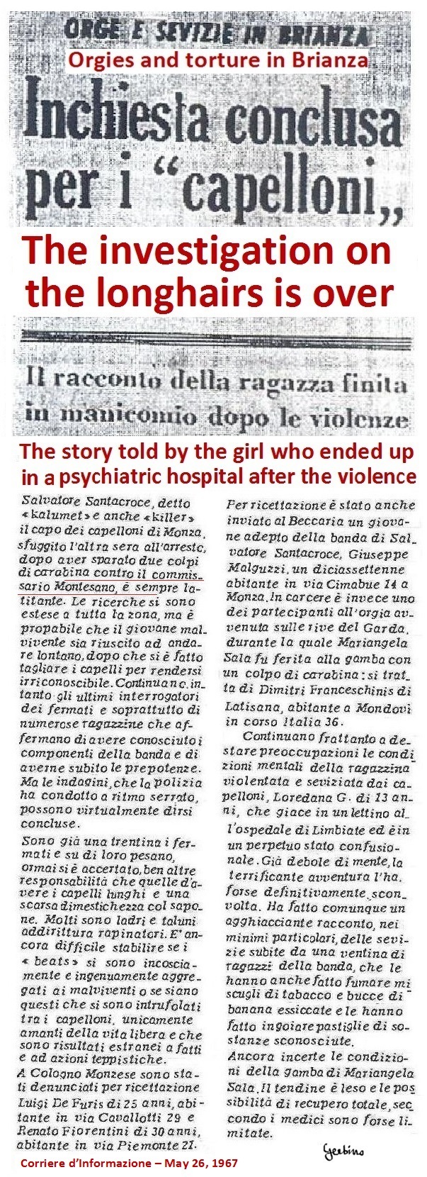 On May 13, the 3 articles reproduced above were published in these 3 newspapers. It was said that two fifteen-year-old girls from Sesto San Giovanni, a city which forms a whole with Milan as an urbanization. had traveled to Rome together with Fabio Bertolini, a young man who, once in Rome, had forced them to prostitute themselves with several men. Fabio Bertolini was described as a Beat, then captured by the carabinieri in a Beat campsite in the Vigentino district. In these three articles it was not specified that the campsite belonged to the Mondo Beat Movement, but none of the readers would have doubted it, given that no other Beat campsite existed anywhere else in the world.