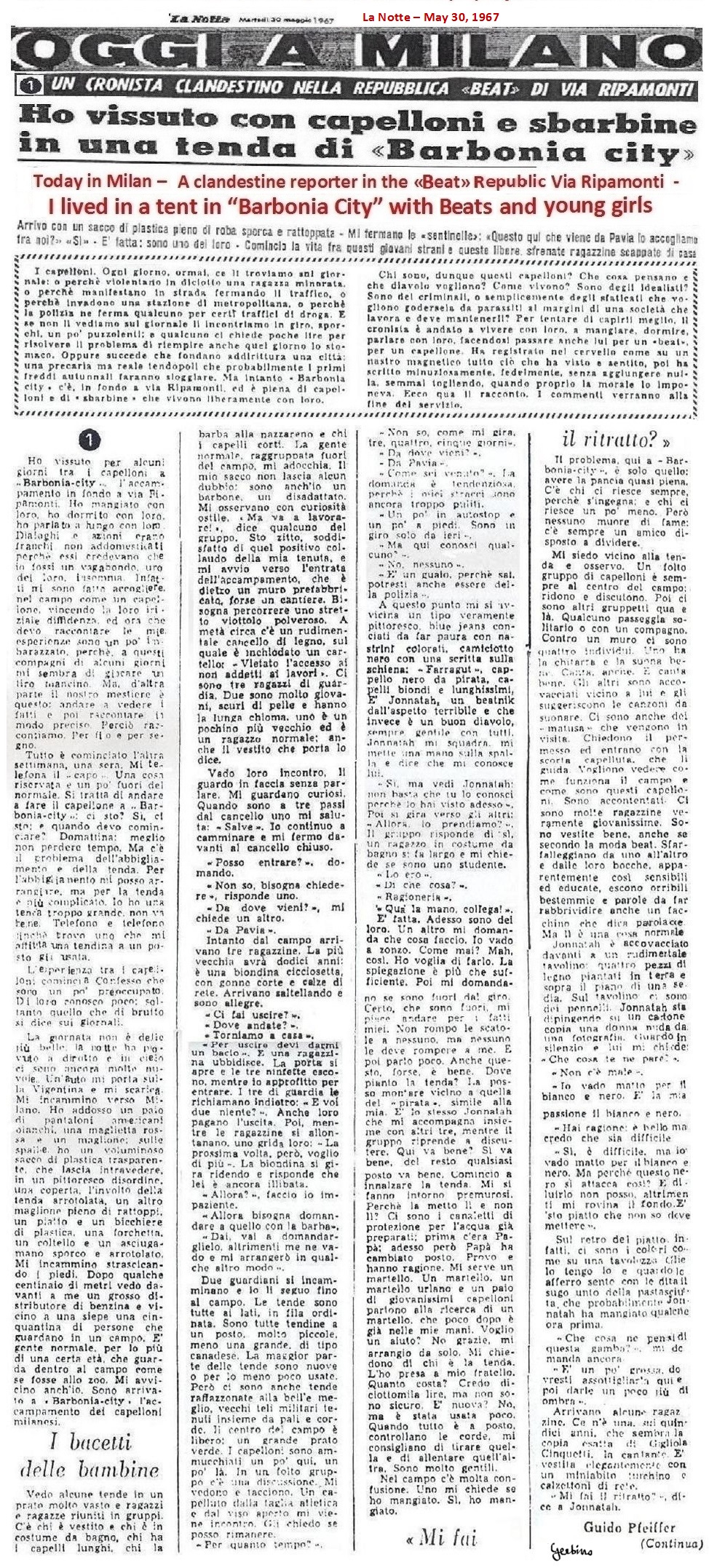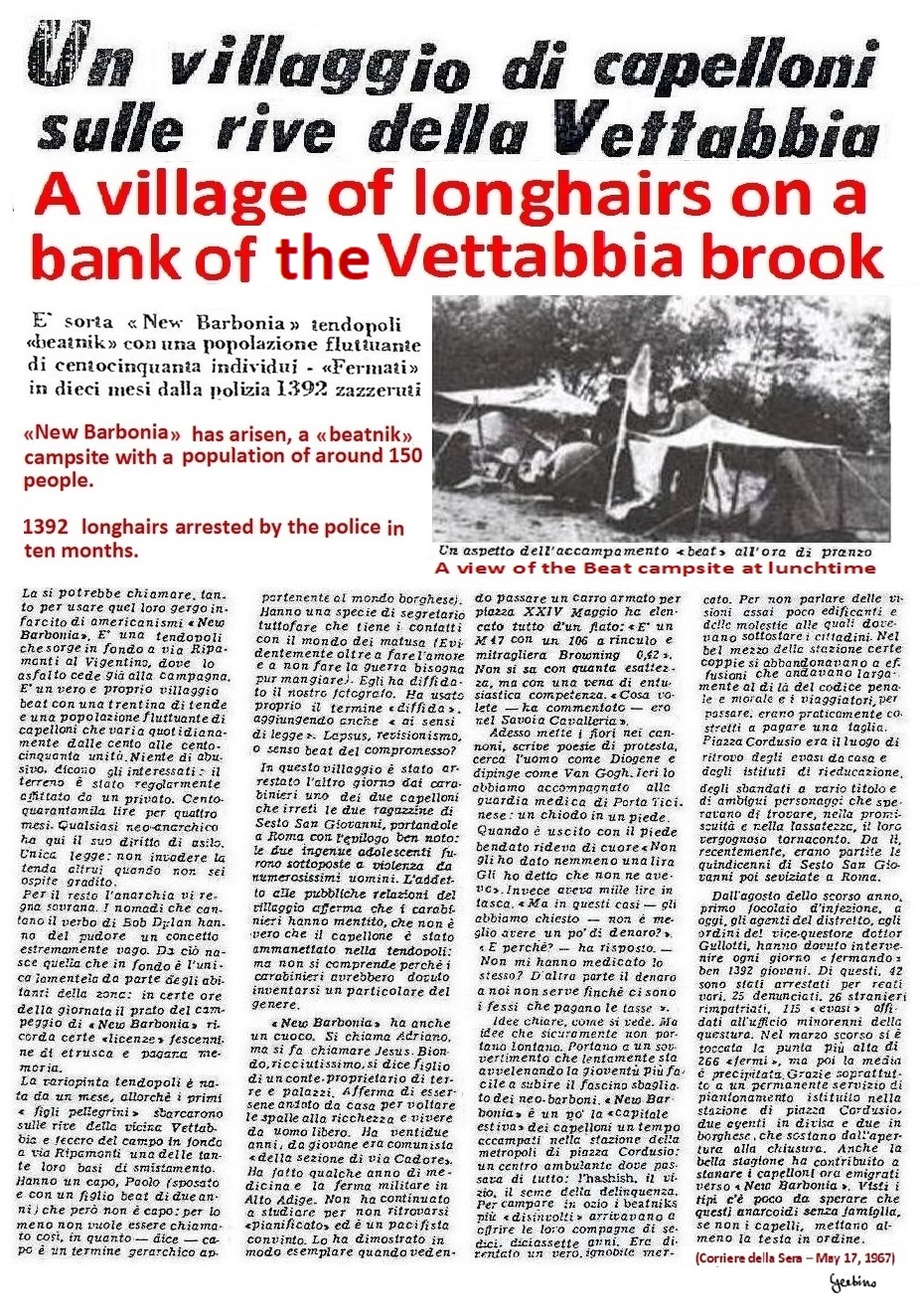 A few days later, that is, on May 17, another article appeared in the Corriere della Sera, where it was told how a Beat tent city had arisen on the banks of the Vettabbia stream. This tent city, which Corriere della Sera nicknamed "Nuova Barbonia" (New City of Vagabonds), was described as a place where drugs spread and underage girls were forced into prostitution and, as proof of this, the case of the two girls of Sesto San Giovanni was mentioned. But this alone would not have alarmed us, as we were used to receiving insults from the Corriere della Sera, what was alarming instead was that in this article Adriano Carminati was described as a former communist activist who had joined the Beats and was now the cook of Nuova Barbonia, the which was false, since Adriano Carminati was not a communist but a well-known fascist militant and not the cook of Nuova Barbonia, where the cook was Roccia