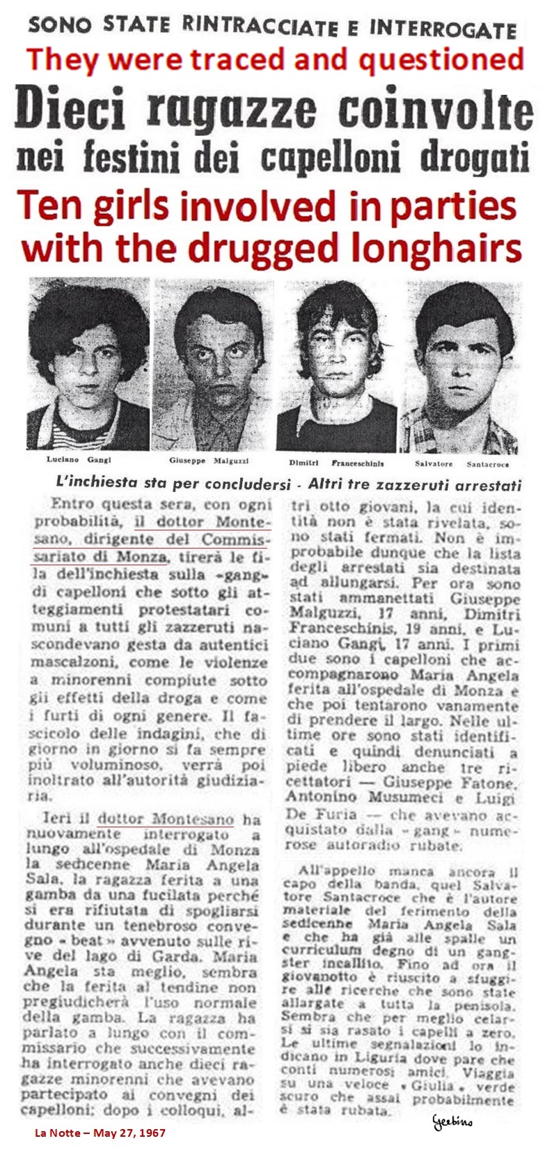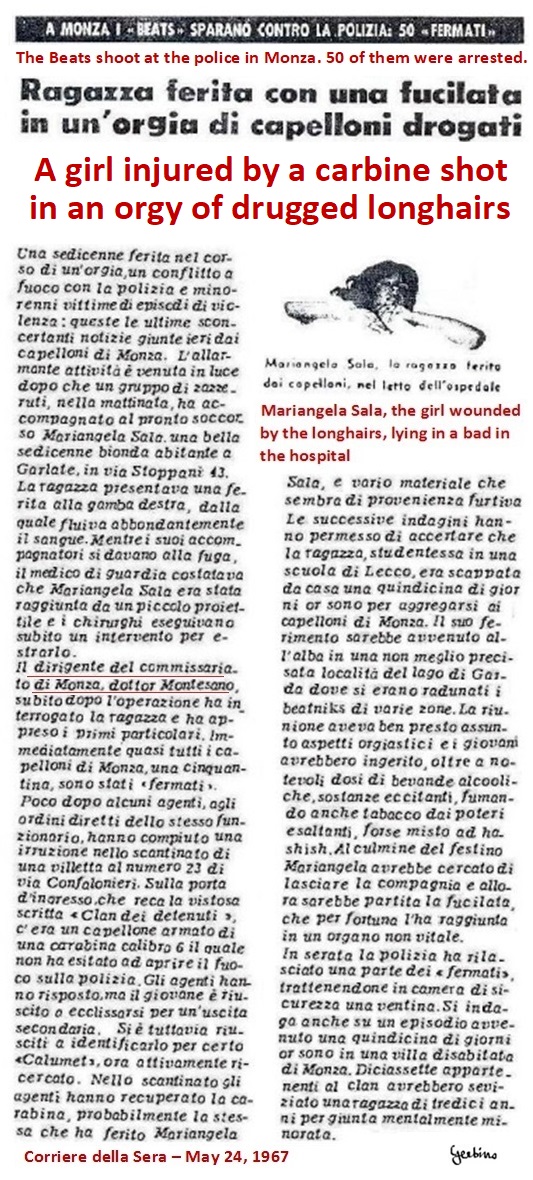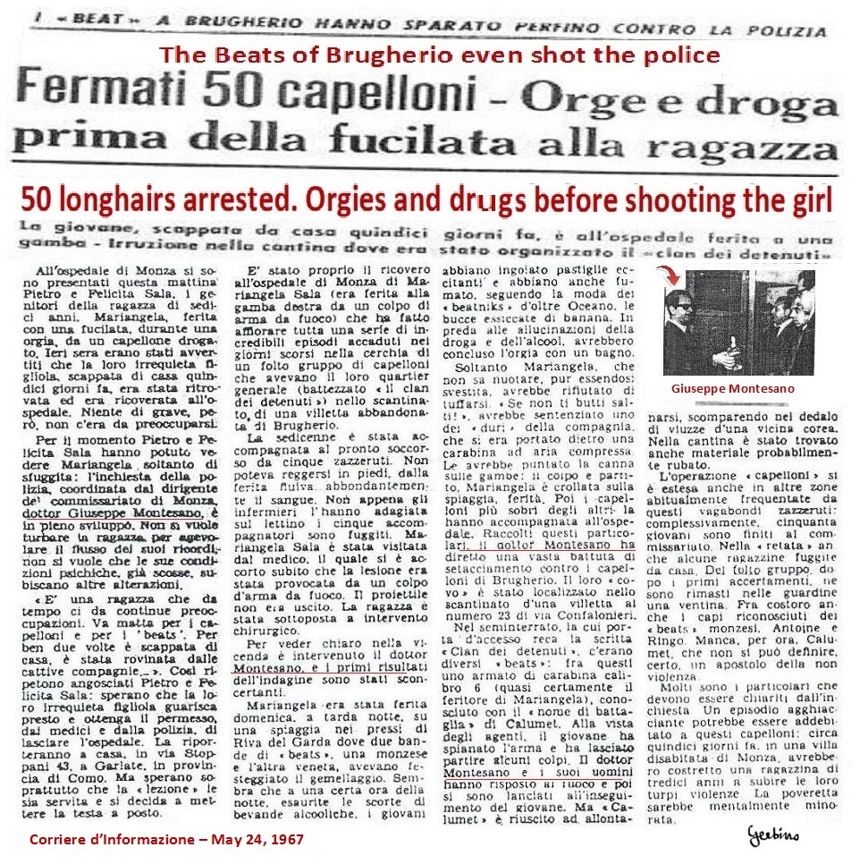 Giuseppe Montesano found the pretext to start with this dirty job when 5 Beats have accompanied a 16 year girl, Mariangela Sala, to the hospital in Monza. The girl had been shot in a leg with a carbine, by Salvatore Santacroce, an 18-year-old Sicilian, common criminal, wanted for aggravated robbery, unauthorized possession of firearms and escape from a juvenile prison in Palermo. After his escape from the juvenile prison in Palermo, Salvatore Santacroce had hidden for a year in Brianza, where he had formed a gang with other common criminals. The girl, who had fled from home, had flirted with him over the course of a week, after which she wanted to end the relationship, but at that Santacroce had shot her in a leg. This had happened late at night on the open. The 5 Beats, having met the injured girl by chance, accompanied her to the hospital. But police commissioner Giuseppe Montesano, instead of praising them, indicted the 5 Beats as accomplices of Salvatore Santacroce, who in the meantime had escaped capture. Furthermore, Giuseppe Montesano would have classified as Beats all young offenders recently arrested in his jurisdiction and would have described Salvatore Santacroce as the head of the Beats of Brianza.