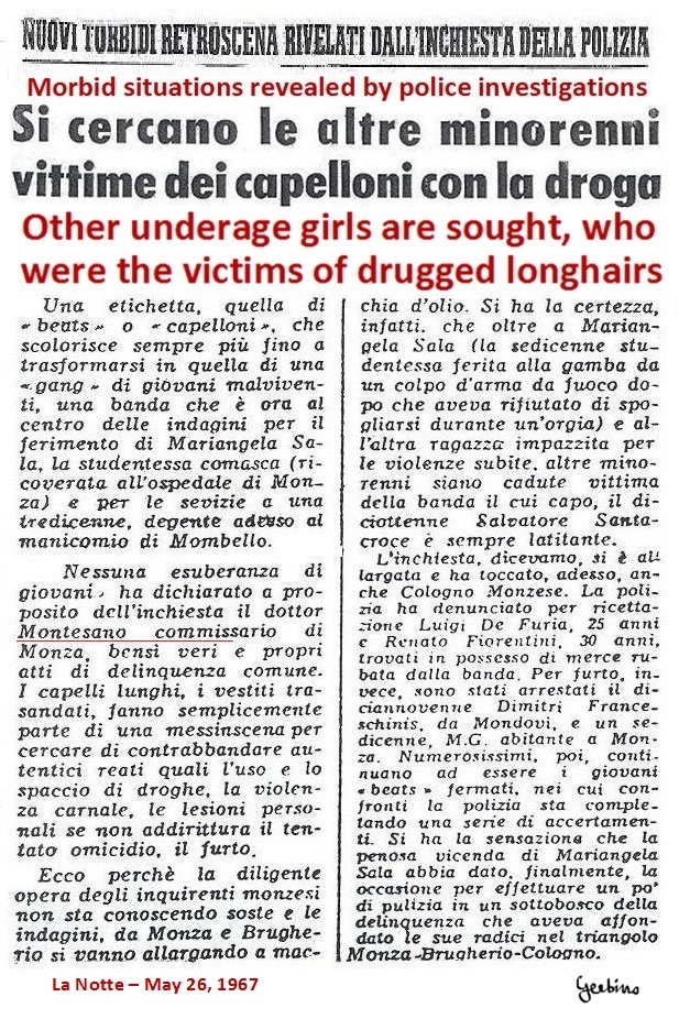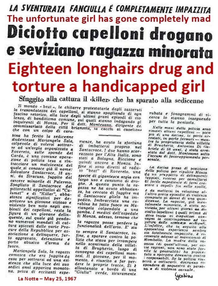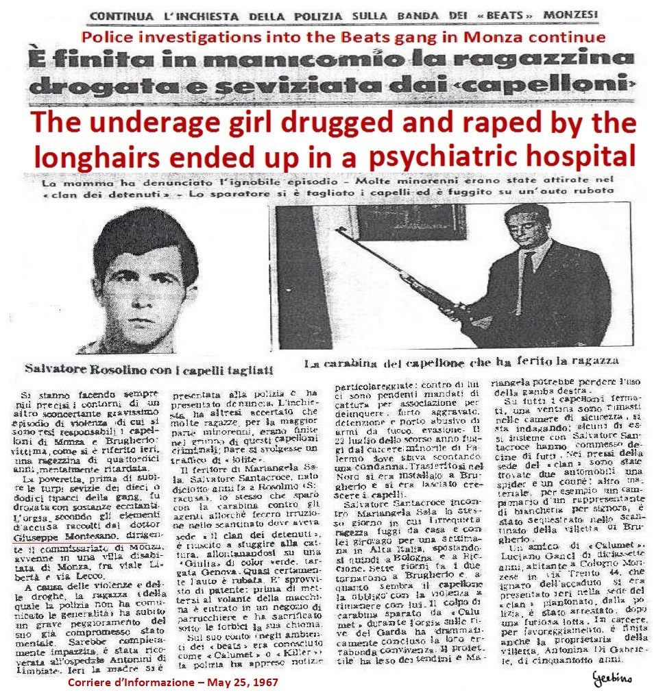 Below is a reproduction of the articles that Corriere della Sera, Corriere d'informazione and La Notte published on the occasion of this campaign against the Beats. Clearly the 3 newspapers had concocted these articles with Giuseppe Montesano and in each of them he was cited as the brave police commissioner who had faced the Beats, even when they had shot to kill him, and it was described how Giuseppe Montesano had investigated many girls, who were been tortured and raped by the Beats, and among these girls a disabled girl, who had been raped by 18 (eighteen) Beats and had gone completely mad.