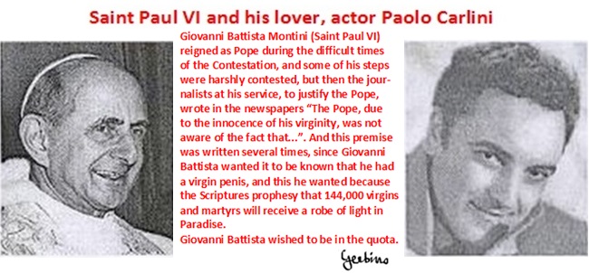 Pope Giovanni Battista Montini (Saint Paul VI) reigned in the difficult times of the Contestation and some of his acts were harshly contestated, but then the journalists at his service, to justify the conduct of the Pope, wrote in the newspapers "The Pope, due to the innocence of his virginity, could not be aware of the fact that... ". And this affirmation of the innocence of the Pope due to his virginity was made several times in the media, because the Pope wanted it to be known that he had a virgin penis, and this because in the Scriptures it is prophesied that in paradise 144,000 virgins and martyrs will be dressed in a mantle of light. Giovanni Battista wanted to be in the quota.