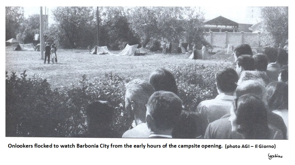 On the morning of May 3rd, Eros Alesi Pasticca arrived at the campsite with a tent. Those who were there ran to greet him. Eros Alesi was the natural detector of moods and trends of the youths of the Base of Mondo Beat and since he liked camping, we had to expect that many others would have done the same. And in fact on the same day other young people arrived to set up tents and among them there were Frenchmen, Germans, Australians. Some high school students who frequented the Cave also came to visit. And from that day on, more and more young people would come to pitch tents in Barbonia City.