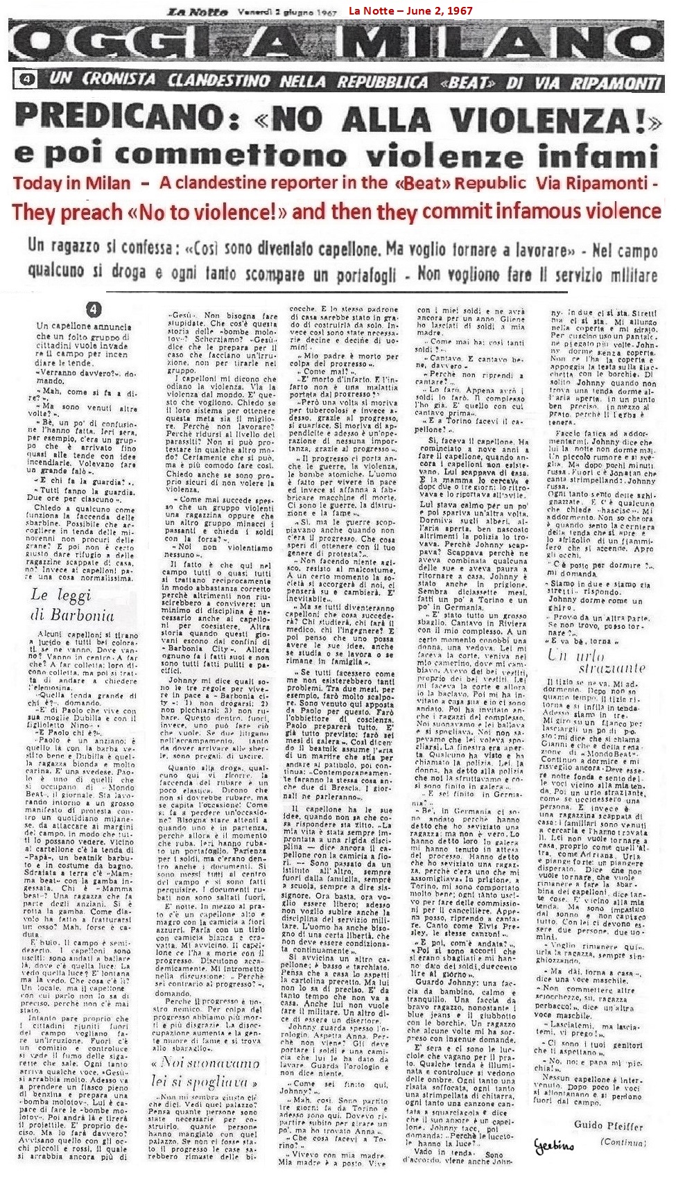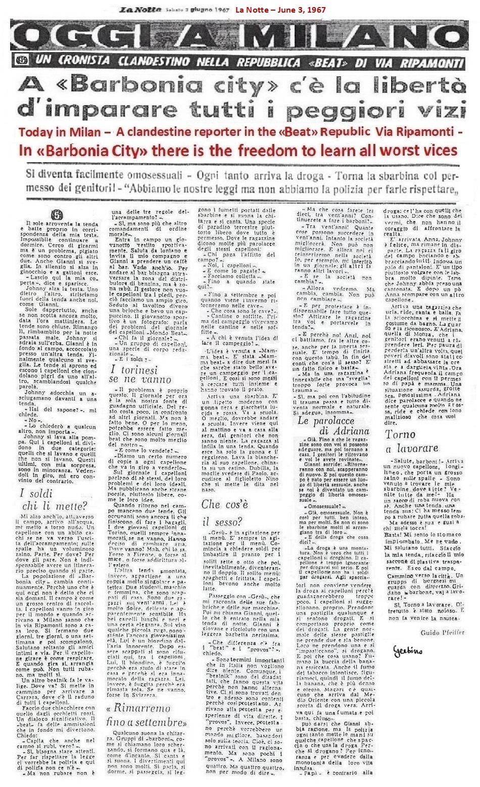As continuation of the press campaign against the Beats, 5 articles by La Notte would have appeared in five consecutive days. They covered an entire page each and were intended to give a mortal blow to the image of the Mondo Beat Movement. But the forcing with which La Notte distorted the true story of the Movement was evident and it was understandable how these articles were not written by a journalist hidden in Barbonia City, as La Notte pretended, but were written under the supervision of a priest, because they reeked of false morality and parish terminology.