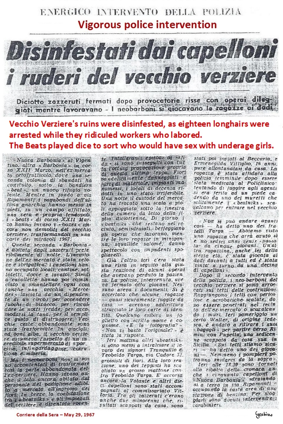 At the end of this grotesque farce, which lasted 5 days, the fifty Beats or so, indicted by Giuseppe Montesano, were promptly released by the judiciary, as they were unrelated to any criminal act, but Corriere della Sera, Corriere d'informazione and La Notte didn't provide any news about this, as they were busy looking for other crimes perpetrated by the Beats elsewhere.