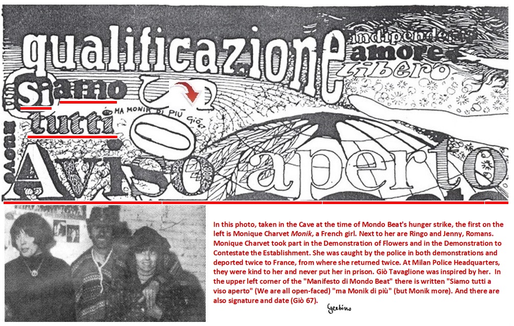 Monique Charvet took part in the Demonstration of Flowers and in the Demonstration to Contestate the Establishment. She was caught by the police in both demonstrations and deported twice to France from where she returned to Milan. At the Police Headquarters they were kind to her and never put her in prison. Giò Tavaglione was inspired by her. In the upper left corner of the "Manifesto di Mondo Beat" there is written "Siamo tutti a viso aperto" (We are all open-faced) "ma Monik di più" (but Monik more). And there are also signature and date (Giò 67).