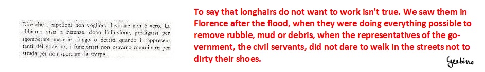 Giangiacomo Feltrinelli: "To say that longhairs do not want to work isn't true. We saw them in Florence after the flood, when they were doing everything possible to remove rubble, mud or debris, when the representatives of the government, the civil servants, did not dare to walk in the streets not to dirty their shoes".