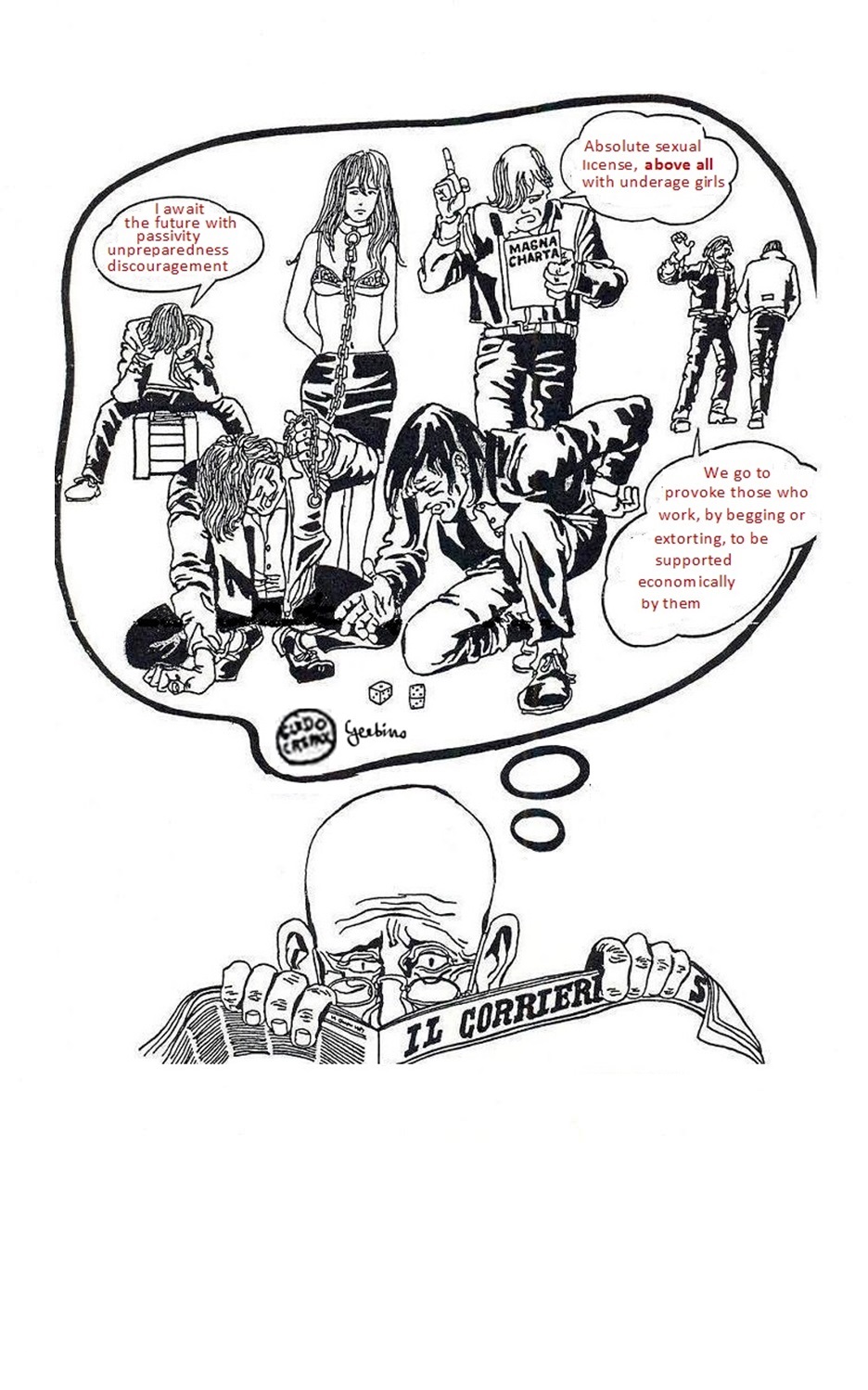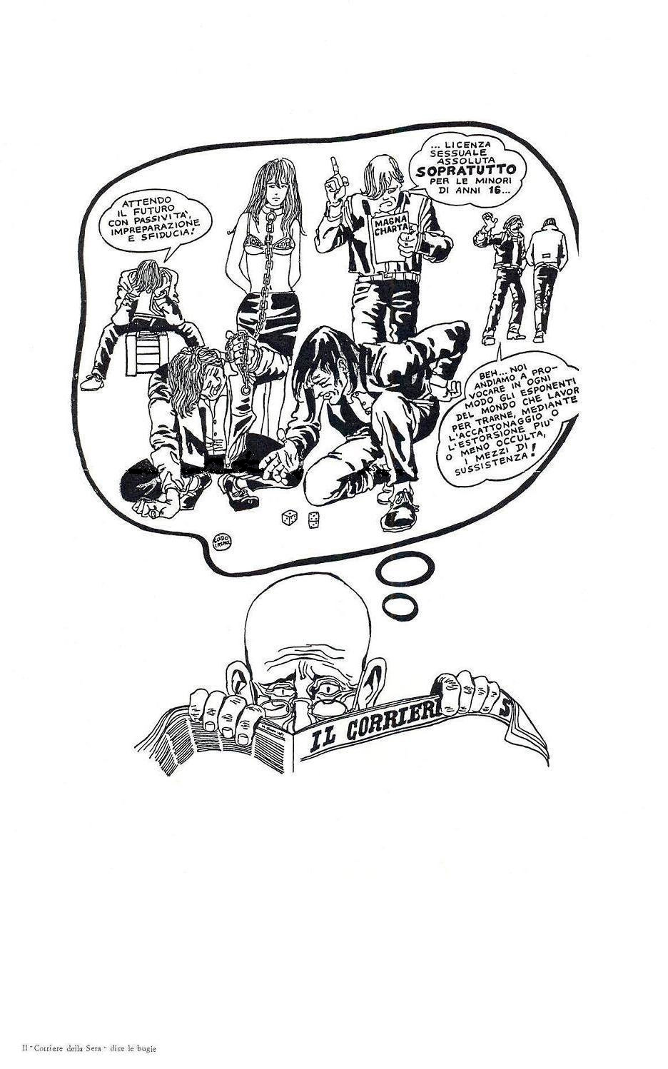 On this back cover is a reproduction of an illustration by Guido Crepax, a famous artist, who made fun of the Corriere della Sera, whose articles often said nonsense about the Beats, say, played dice to decide who would have sex with the underage girls.