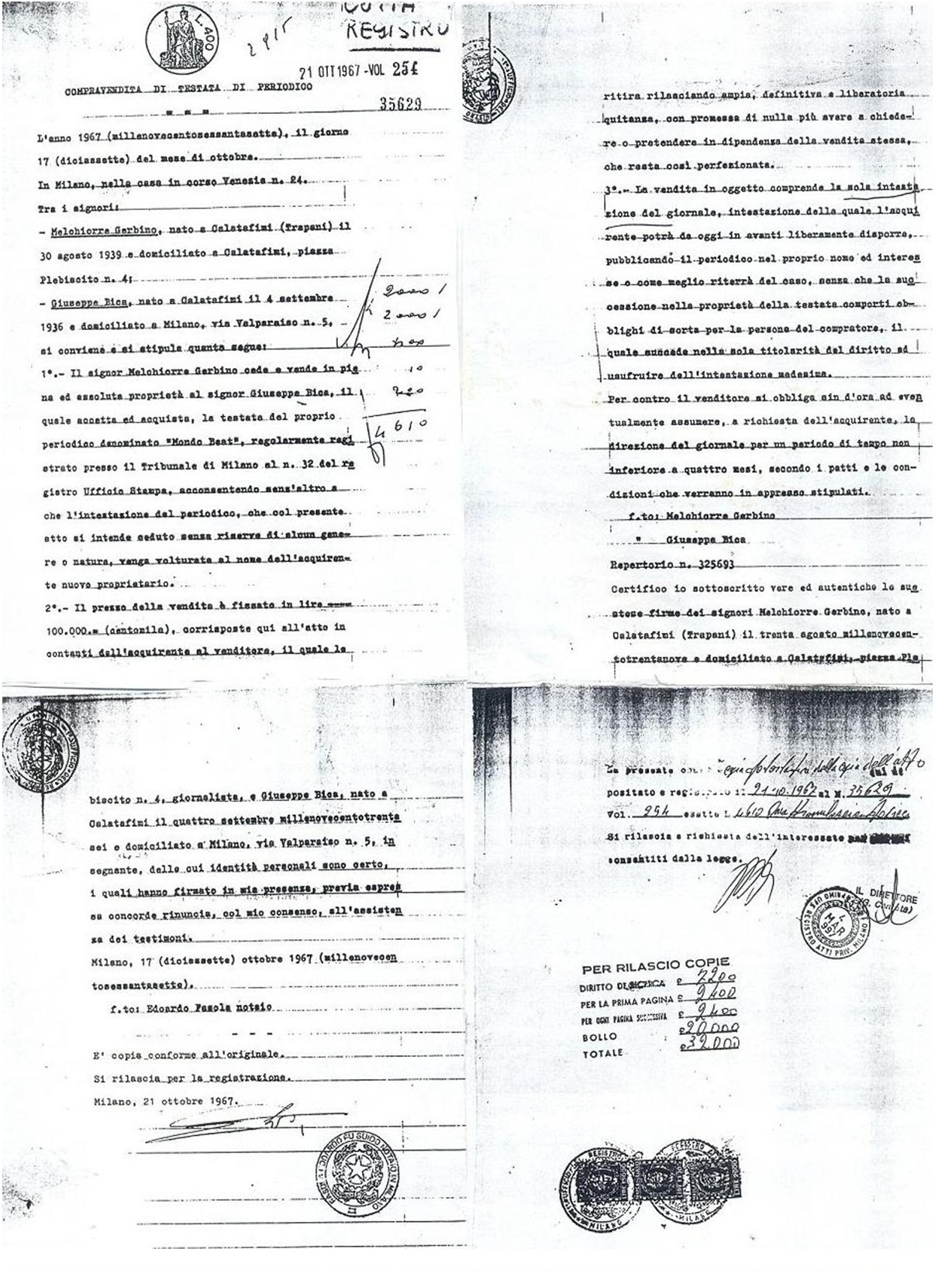 Returning to the topic of Mondo Beat magazine, this was not sold to the publisher Giangiacomo Feltrinelli, nor to any political party (some of them would have bought it at any price). Instead it happened that in October 1967, Giuseppe Simone, a wine merchant in Milan, who was a classmate of Melchiorre Gerbino at secondary school in Calatafimi, their hometown in Sicily, sent to him a common friend from Calatafimi, Giuseppe Bica, then a teacher in Milan, with the request of buying the Mondo Beat magazine. Having Melchiorre Gerbino assented to the accomplishment of this operation, Giuseppe Bica in turn contacted another common friend from Calatafimi, Salvatore Scandariato, then a lawyer who practiced in Milan, for being assisted in the deed of sale.