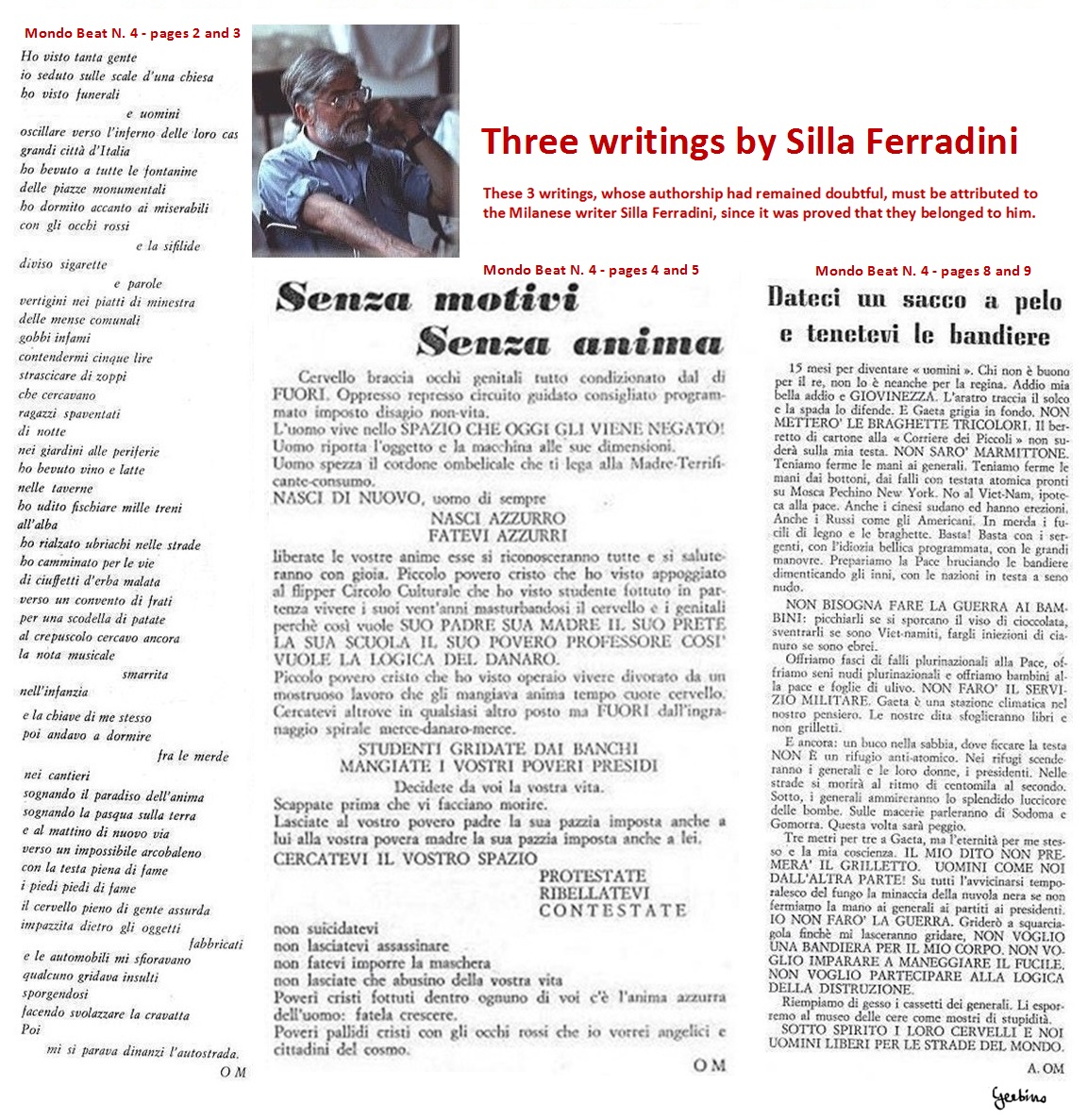 In 2017, that is, 50 years after the time of Mondo Beat, trying to find the surname of that Enea who created the Mondo Beat and Onda Verde logos, a surname he had forgotten, Melchiorre Gerbino made several phone calls and among others he called Silla Ferradini. As on this occasion the two found a pleasant way to talk each other, they had a long conversation during which Ferradini confessed to Gerbino that he was the author of those articles signed "OM", "A.OM" and "Ohm", which were published in the 6th issue of Mondo Beat magazine.