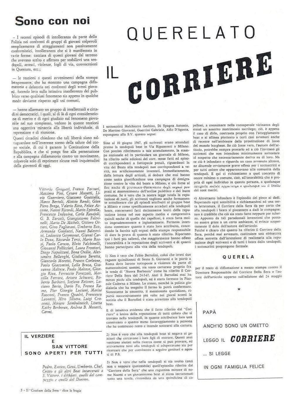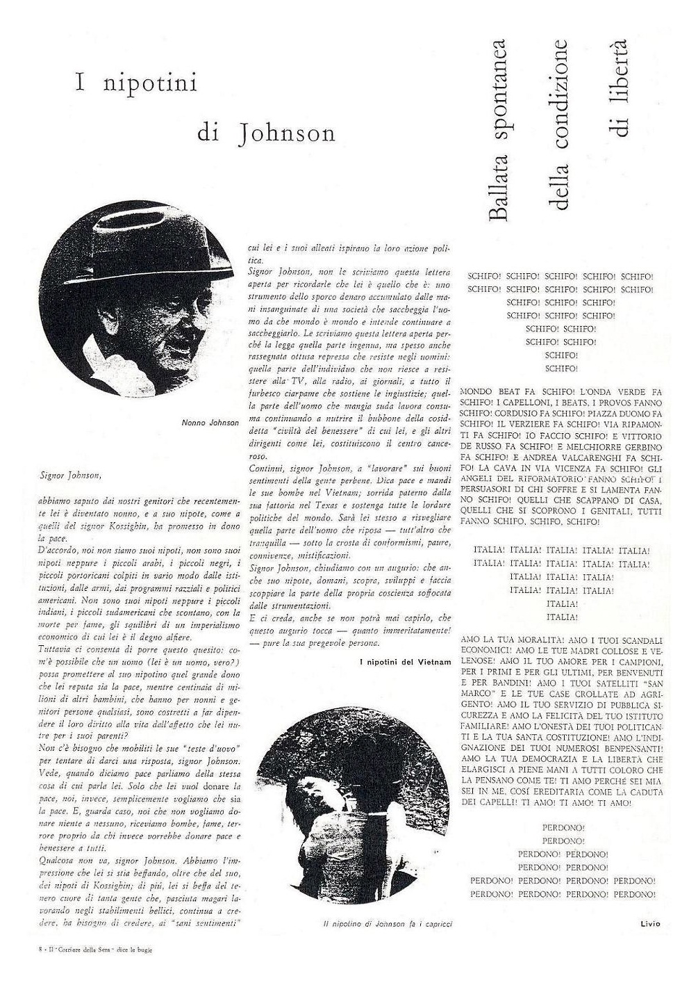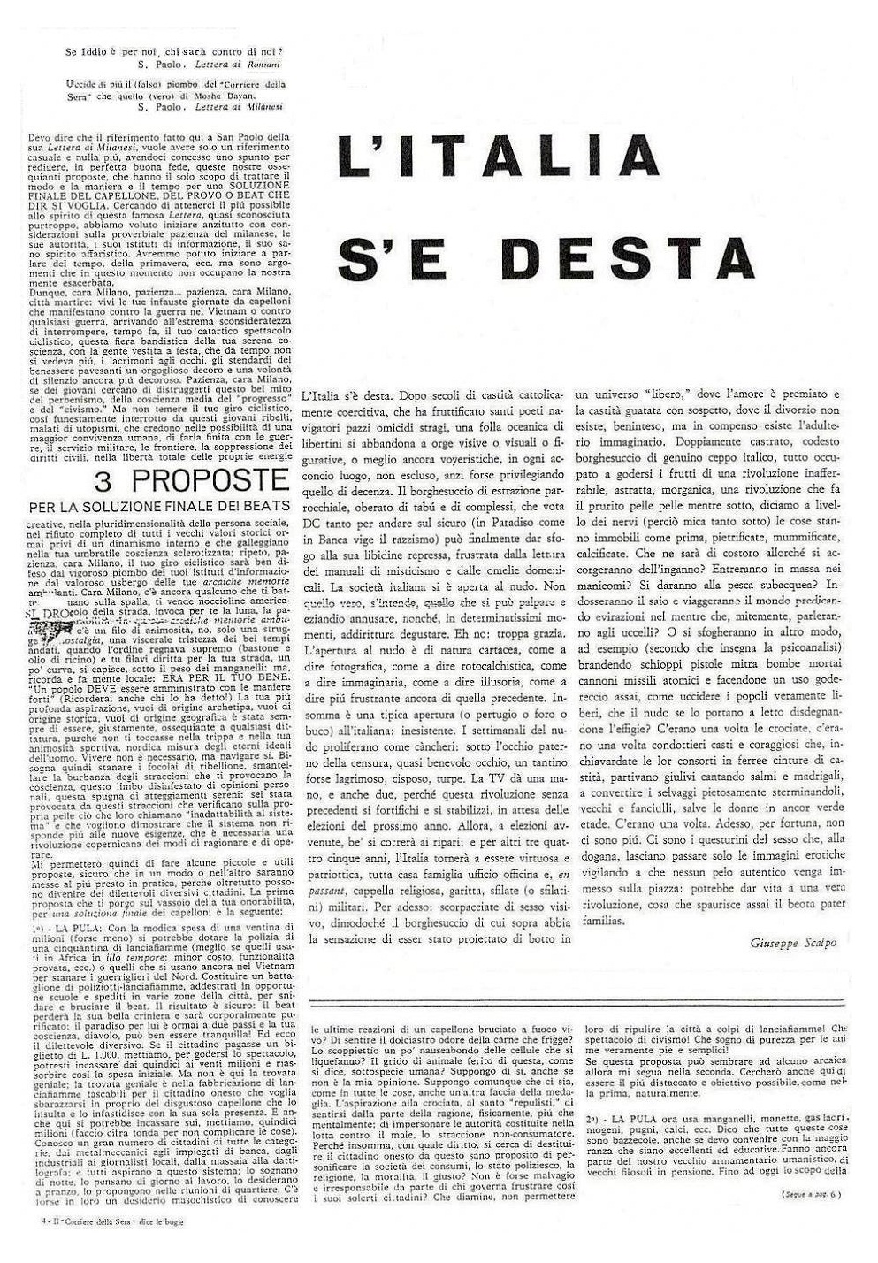 In these pages there are articles of protest for the destruction of the Mondo Beat facilities and the betrayal of the Italian constitution, written by those intellectuals who attended the event of the dissolution of the Movement. They signed their articles with pseudonyms and not with their names, as they were under contract with publishing houses.
