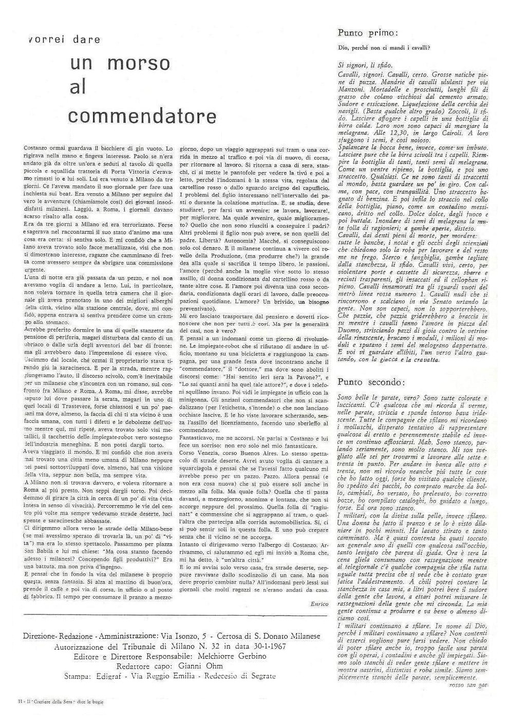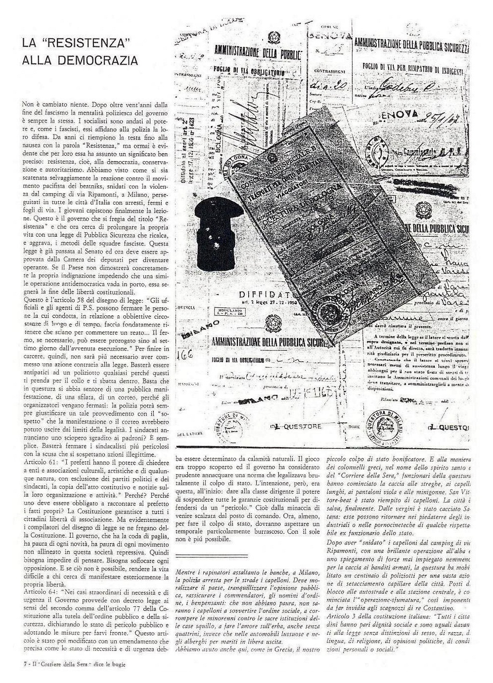 And he told also that he was the author of the article "Milano in stato d'assedio" (Milan in a state of seige), published on the seventh issue of Mondo Beat, but that there had been a scam, since he had signed the article "Ohm", but the signature had been changed in "Gianni Ohm" and the text of the article had been altered in some parts and in other parts substituted with a completely different text.