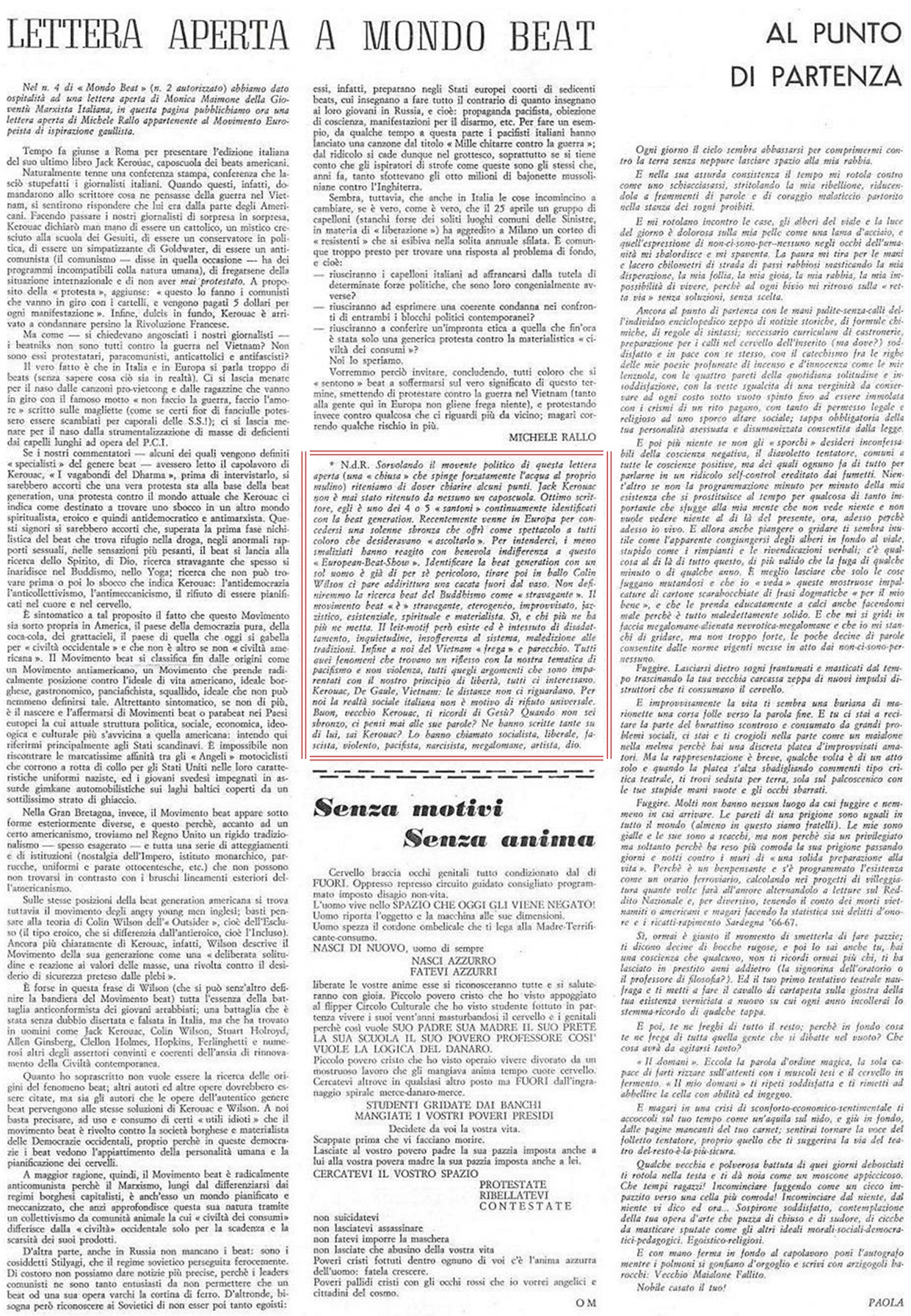 When he introduced himself, he said he was a homosexual, a Catholic one, and asked if he could be on the editorial board of Mondo Beat magazine. Melchiorre Gerbino accepted his request, as that was the moment when homosexuals began to take a stand to assert their civil rights. But Gianni De Martino never wrote about the civil rights of the homosexuals, as it was expected, he instead wrote an article with which he attacked Jack Kerouac because he got drunk instead of thinking about Jesus