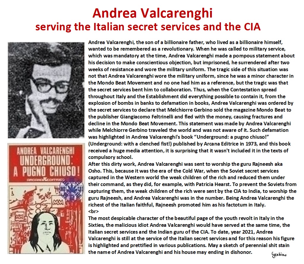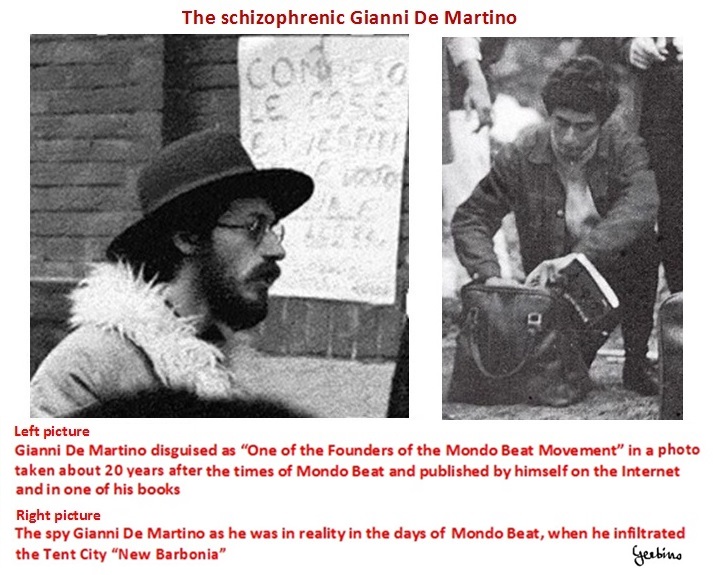 Back to the years when he was schooling, at a certain moment the Salesian priests have disdained to have sex with him, as he had gone beyond the age of puberty. Then those priests instructed him on how to act as a spy on behalf of the Vatican. And so Gianni De Martino first would have infiltrated a youth section of the Italian Communist Party in the city of Salerno, later, when he was 19, the Salesian priests have sent him to Milan, to infiltrate Mondo Beat.