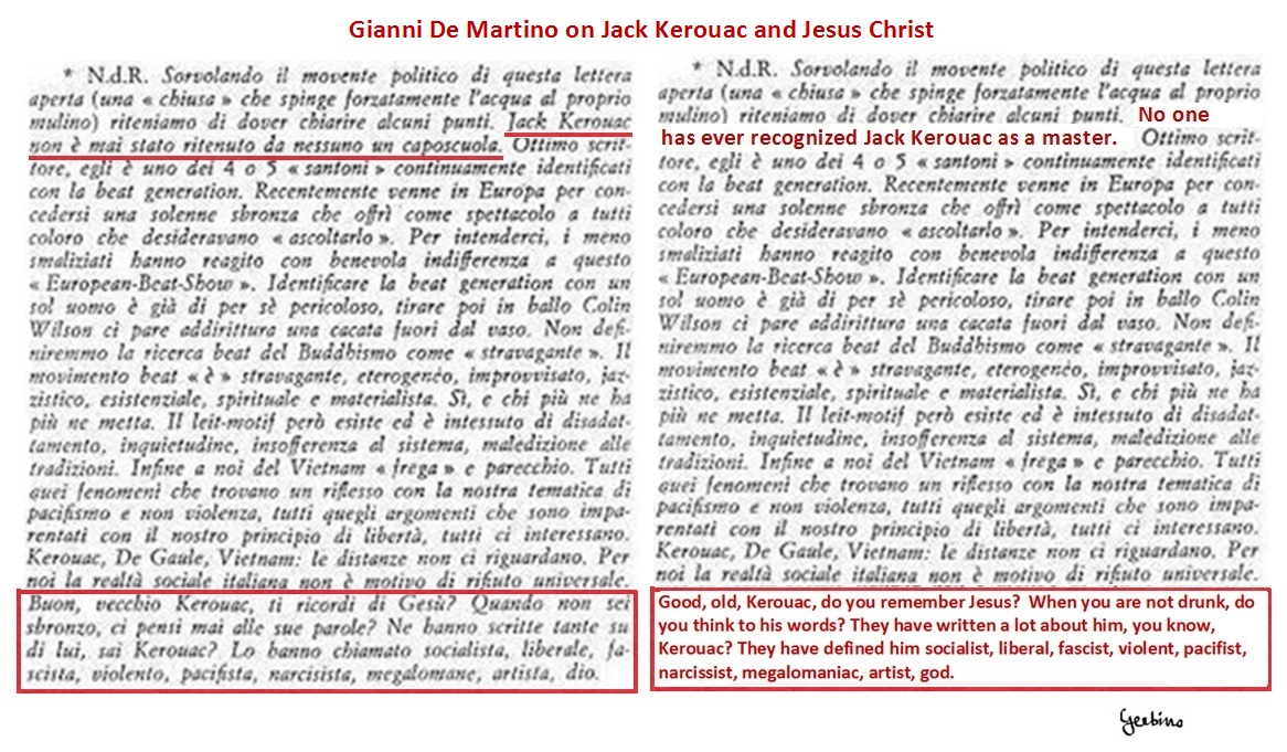 Gianni De Martino wrote: "No one has ever recognized Jack Kerouac as a master... Good, old, Kerouac, do you remember Jesus? When you are not drunk, do you think to his words? They have written a lot about him, you know, Kerouac? They have defined him socialist, liberal, fascist, violent, pacifist, narcissist, megalomaniac, artist, god."