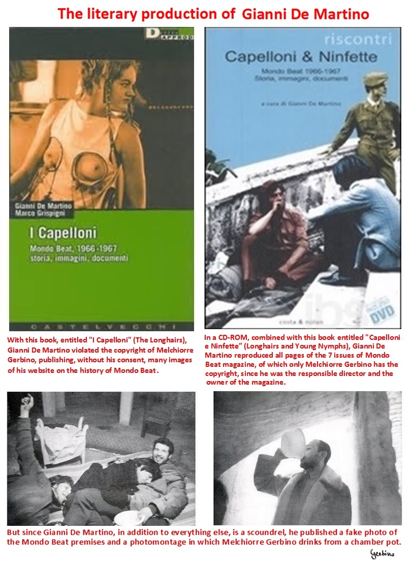 With the book titled "I Capelloni" (The Longhairs) Gianni De Martino violated the copyright of Melchiorre Gerbino, as he published, without permission, many Mondo Beat's images taken from Melchiorre Gerbino's website.