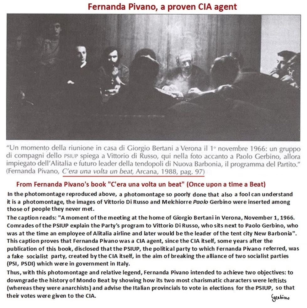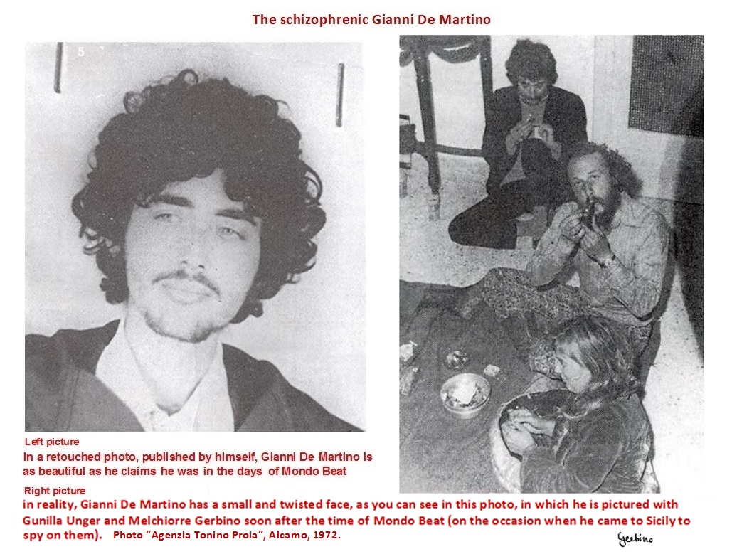 In reconstructing the history of Mondo Beat, Melchiorre Gerbino could not help but say that Gianni De Martino was an agent of the Italian secret services, and this because in the twenty years which had elapsed from the times of Mondo Beat, Gianni De Martino had distorted the history of Mondo Beat in his writings, and Melchiorre Gerbino could have forgiven him anything else, but not to distort the history of Mondo Beat.