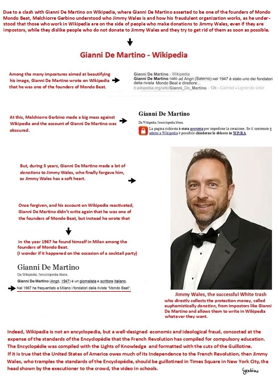 Due to a clash with Gianni De Martino on Wikipedia, where Gianni De Martino asserted to be one of the founders of Mondo Beat, Melchiorre Gerbino understood who Jimmy Wales was in the reality and how his fraudulent organization works, as he understood that those who work in Wikipedia are on the side of people who make donations to Jimmy Wales, no matter if they are impostors, while people who don't donate to Jimmy Wales are disliked.