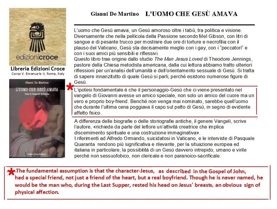 In this advertisement, Gianni De Martino affirmed: "The fundamental assumption is that the character-Jesus, as described in the Gospel of John, had a special friend, not just a friend of the heart, but a real boyfriend. Though he is never named, he would be the man who, during the Last Supper, rested his head on Jesus' breast, an obvious sign of physical affection". Finally, in the same advertisement, Gianni De Martino affirmed that his discovery of Jesus as a sexual invert was important for the current European situation and particularly for Italy.