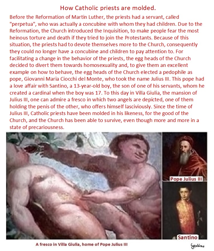 Before the Reformation of Martin Luther, the priests had a servant, called "perpetua", who was actually a concubine with whom they had children. Due to the Reformation, the Church introduced the Inquisition, to make people fear the most heinous torture and death if they tried to join the Protestants. Because of this situation, the priests had to devote themselves more to the Church, consequently they could no longer have a concubine and children to pay attention to. For facilitating a change in the behavior of the priests, the egg heads of the Church decided to divert them towards homosexuality and, to give them an excellent example on how to behave, the egg heads of the Church elected a pedophile as pope, Giovanni Maria Ciocchi del Monte, who took the name Julius III. This Pope had a love relationship, of public opinion, with Santino, a 13-year-old boy, son of one of his servants, whom he created a cardinal when the boy was 17. To this day in Villa Giulia, the mansion of Julius III, one can admire a fresco in which two angels are depicted, one of them holding the penis of the other, who offers himself lasciviously. Since the time of Julius III, Catholic priests have been molded in his likeness, for the good of the Church, and the Church has been able to survive, even though more and more in a state of precariousness.