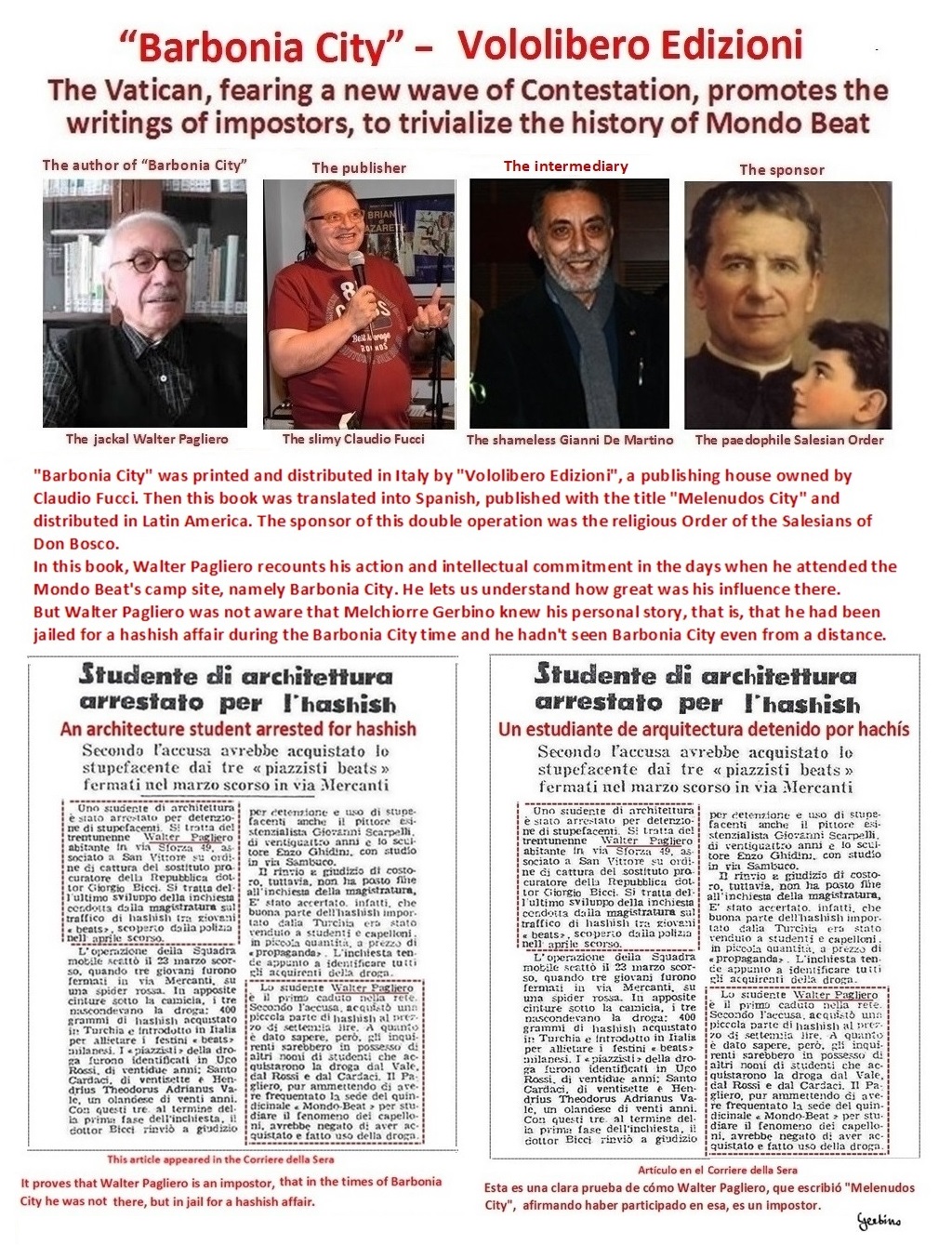 Thus, Melchiorre Gerbino felt intimately gratified when he learned of what had happened with his book, as he had confirmation of how the Vatican mortally fears the Contestation. Nor did Melchiorre Gerbino brought any legal action, aware that resorting to stamped paper is ridiculous in the confrontation between the Contestation and the Vatican. But, stimulated by the fears of the Vatican, he wrote much more about Mondo Beat, in books and on the Internet. Of course, the Vatican reacted, and in two ways, that is, by trying to have Melchiorre Gerbino killed and by entrusting to Gianni De Martino the task of promoting a media campaign to distort and trivialize the story of Mondo Beat as much as possible. And Gianni De Martino committed himself to this task