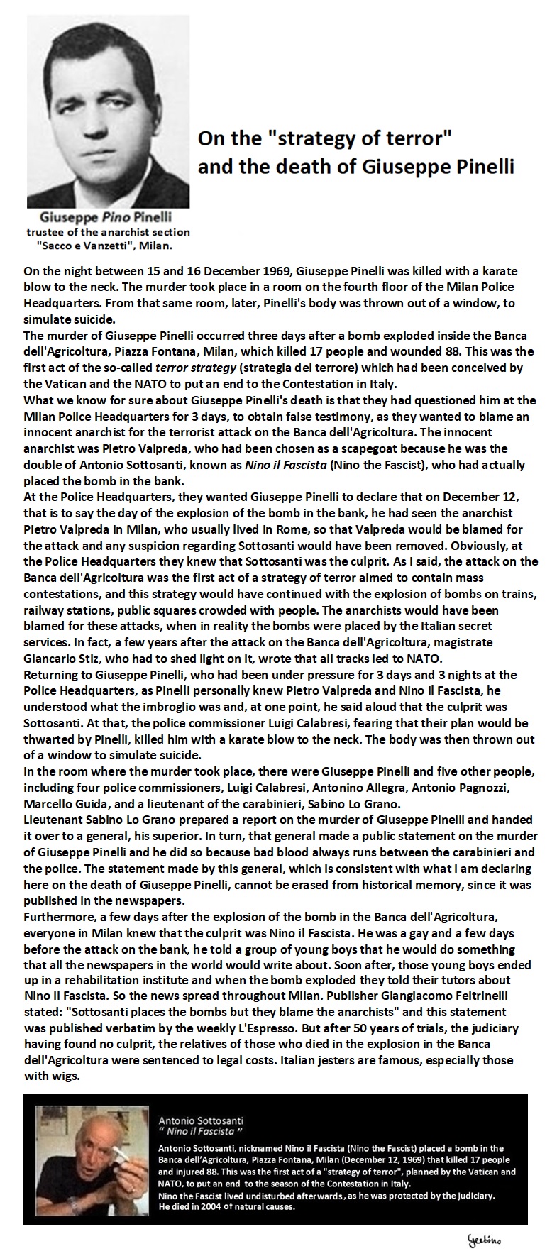 a symbol for all Italian libertarians, and the "Centro Studi Libertari G. Pinelli" having been created in memory of him, how can the Vatican push a sick person, as Gianni De Martino, to infiltrate such an institution? To which gain?