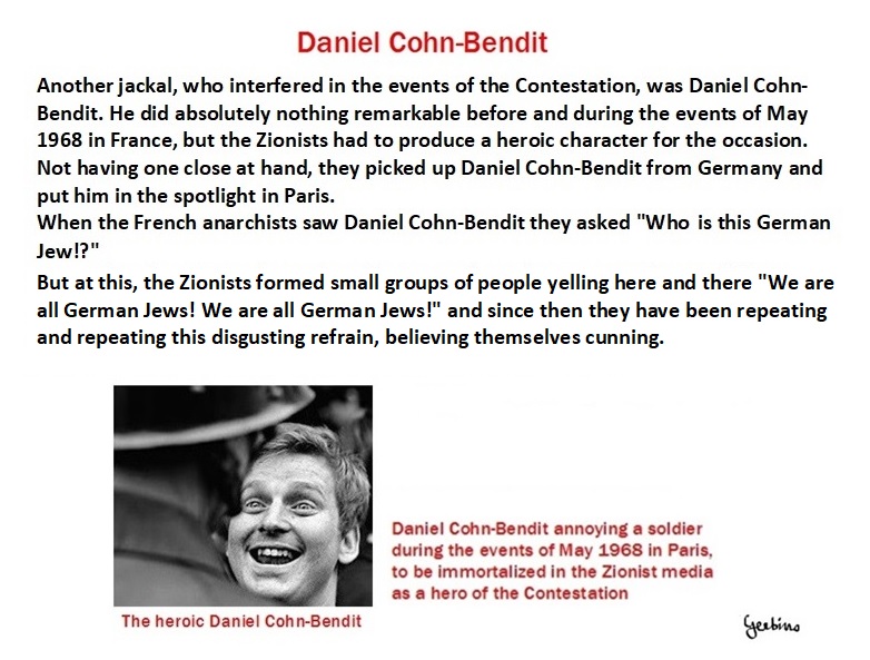 Another jackal, who interfered in the events of the Contestation, was Daniel Cohn-Bendit. He did absolutely nothing remarkable before and during the events of May 1968 in France, but the Zionists had to produce a heroic character for the occasion. Not having one close at hand, they picked up Daniel Cohn-Bendit from Germany and put him in the spotlight in Paris.