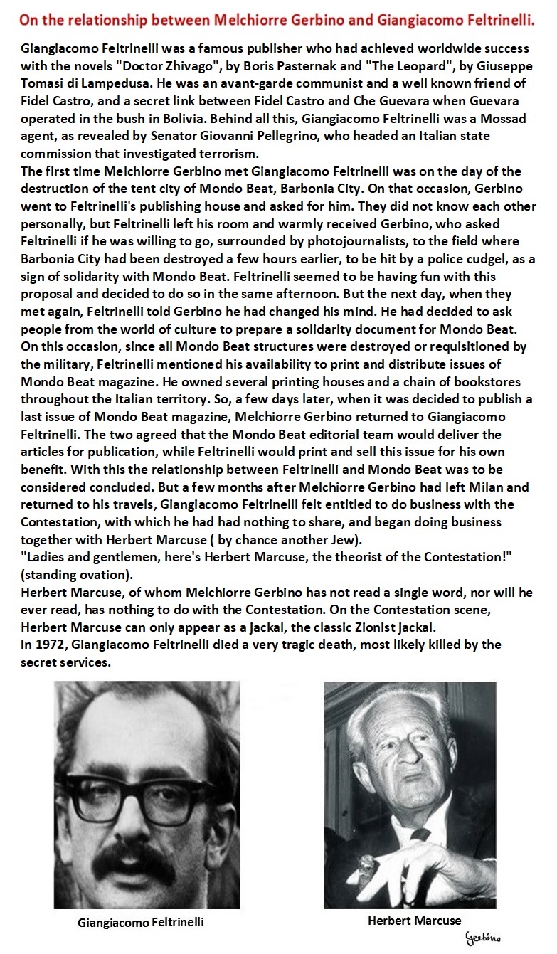 The first time Melchiorre Gerbino met Giangiacomo Feltrinelli was on the day of the destruction of the tent city of Mondo Beat, Barbonia City. On that occasion, Gerbino went to Feltrinelli's publishing house and asked for him. They did not know each other personally, but Feltrinelli left his room and warmly received Gerbino, who asked Feltrinelli if he was willing to go, surrounded by photojournalists, to the field where Barbonia City had been destroyed a few hours earlier, to be hit by a police cudgel, as a sign of solidarity with Mondo Beat. Feltrinelli seemed to be having fun with this proposal and decided to do so in that same afternoon. But the next day, when they met again, Feltrinelli told Gerbino he had changed his mind. He had decided to ask people from the world of culture to participated in a solidarity document for Mondo Beat, which he would publish in the newspapers. On this occasion, since all Mondo Beat structures were destroyed or requisitioned by the military, Feltrinelli mentioned his availability to print and distribute issues of Mondo Beat magazine. He owned several printing houses and a chain of bookstores throughout the Italian territory. So, a few days later, when it was decided to publish a last issue of Mondo Beat magazine, Melchiorre Gerbino returned to Giangiacomo Feltrinelli. The two agreed that the Mondo Beat editorial team would deliver the articles for publication, while Feltrinelli would print and sell this issue for his own benefit. With this the relationship between Feltrinelli and Mondo Beat was to be considered concluded. But a few months after Melchiorre Gerbino had left Milan and returned to his travels, Giangiacomo Feltrinelli felt entitled to do business with the Contestation, with which he had had nothing to share, and he began doing business together with Herbert Marcuse (by chance, another Jew).