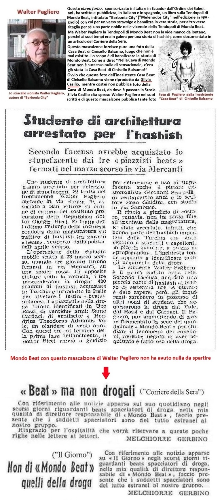 Questo ebreo furbo, Walter Pagliero, sponsorizzato in Italia e in Ecuador dal pedofilo Ordine dei Salesiani, ha scritto e pubblicizza, in italiano e in spagnolo, un libro sulla Tendopoli di Mondo Beat, intitolato "Barbonia City" (nell'edizione in spagnolo "Melenudos City") con cui per un verso stravolge e banalizza la vera storia, per altro verso ritaglia per sé una parte nobile nelle vicende della Tendopoli di Mondo Beat, Barbonia City.