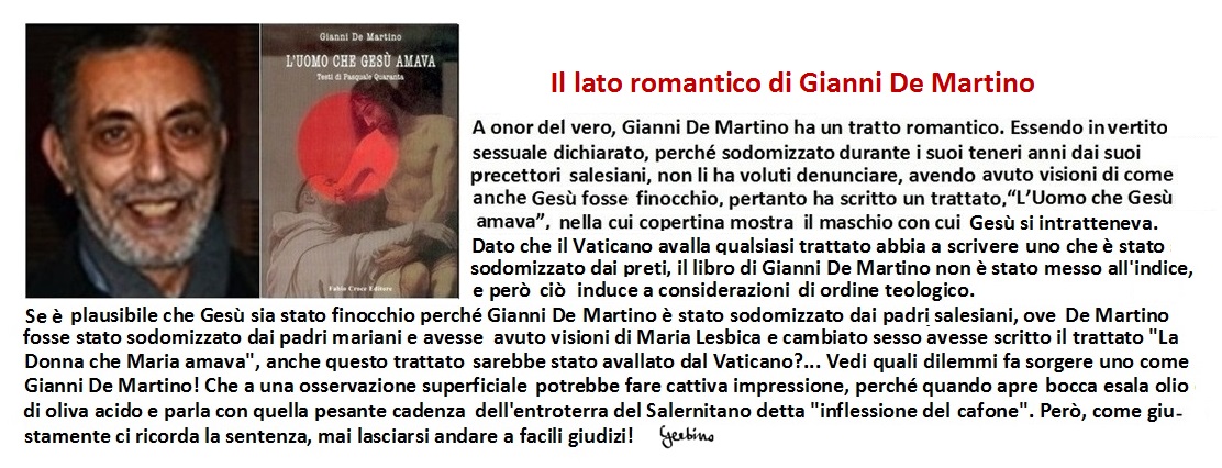 E però, a onor del vero, Gianni De Martino non è solo un agente che al servizio del Vaticano promuove impostori come quelli sopra esposti, perché gli si deve riconoscere pure un tratto romantico