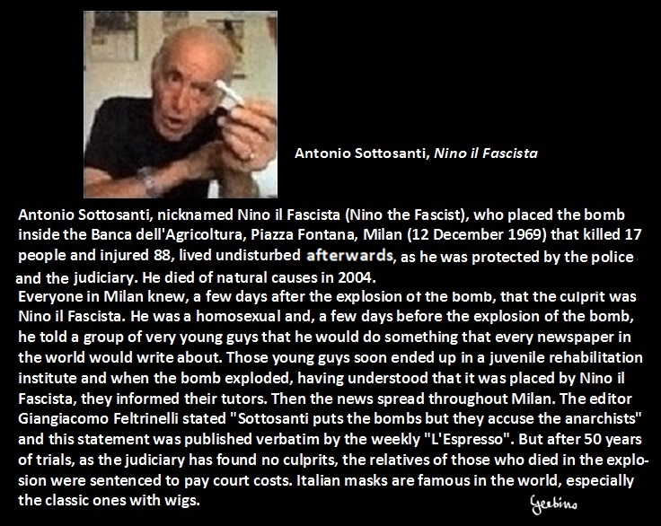 Furthermore, a few days after the explosion of the bomb in the Banca dell'Agricoltura, everyone in Milan knew that the culprit was Nino il Fascista. He was a gay and a few days before the attack on the bank, he told a group of young boys that he would do something that all the newspapers in the world would write about. Soon after, those young boys ended up in a rehabilitation institute and when the bomb exploded they told their tutors about Nino il Fascista. So the news spread throughout Milan. Publisher Giangiacomo Feltrinelli stated: "Sottosanti places the bombs but they blame the anarchists" and this statement was published verbatim by the weekly L'Espresso. But Nino the Fascist lived undisturbed the rest of his life and died of natural causes in 2004, as he was ignored by the judiciary. Instead the judiciary, after 50 years of trials, having found no culprits, sentenced the relatives of those who died in the explosion in the Banca dell'Agricoltura to legal costs. Italian jesters are famous, especially those with wigs.