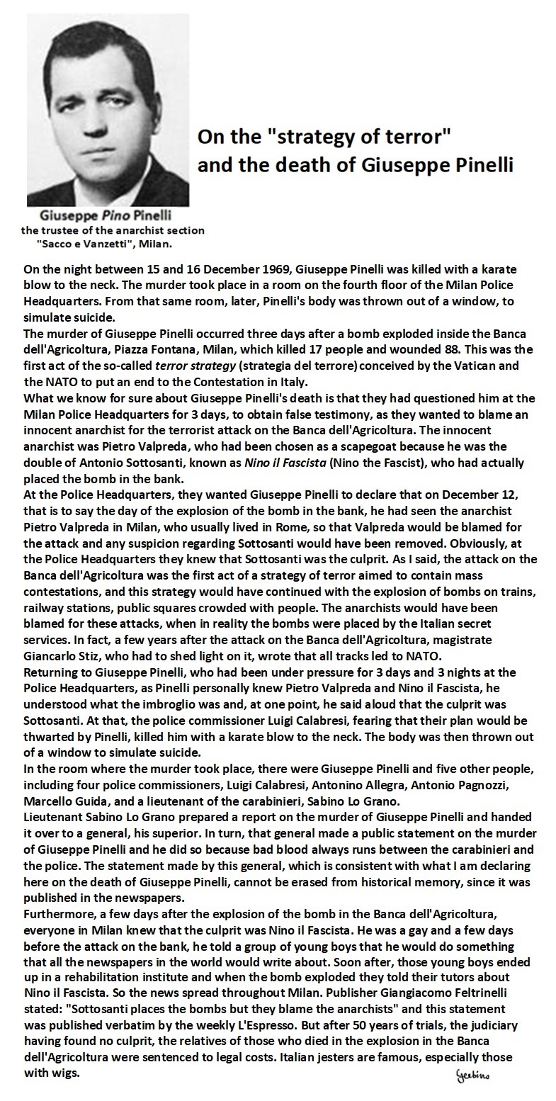 At the Police Headquarters, they wanted Giuseppe Pinelli to declare that on December 12, that is to say the day of the explosion of the bomb in the bank, he had seen the anarchist Pietro Valpreda in Milan, who usually lived in Rome, so that Valpreda would be blamed for the attack and any suspicion regarding Sottosanti would have been removed. Obviously, at the Police Headquarters they knew that Sottosanti was the culprit. As I said, the attack on the Banca dell'Agricoltura was the first act of a strategy of terror aimed to contain mass contestations, and this strategy would have continued with the explosion of bombs on trains, railway stations, public squares crowded with people. The anarchists would have been blamed for these attacks, when in reality the bombs were placed by the Italian secret services. In fact, a few years after the attack on the Banca dell'Agricoltura, magistrate Giancarlo Stiz, who had to shed light on it, wrote that all tracks led to NATO.