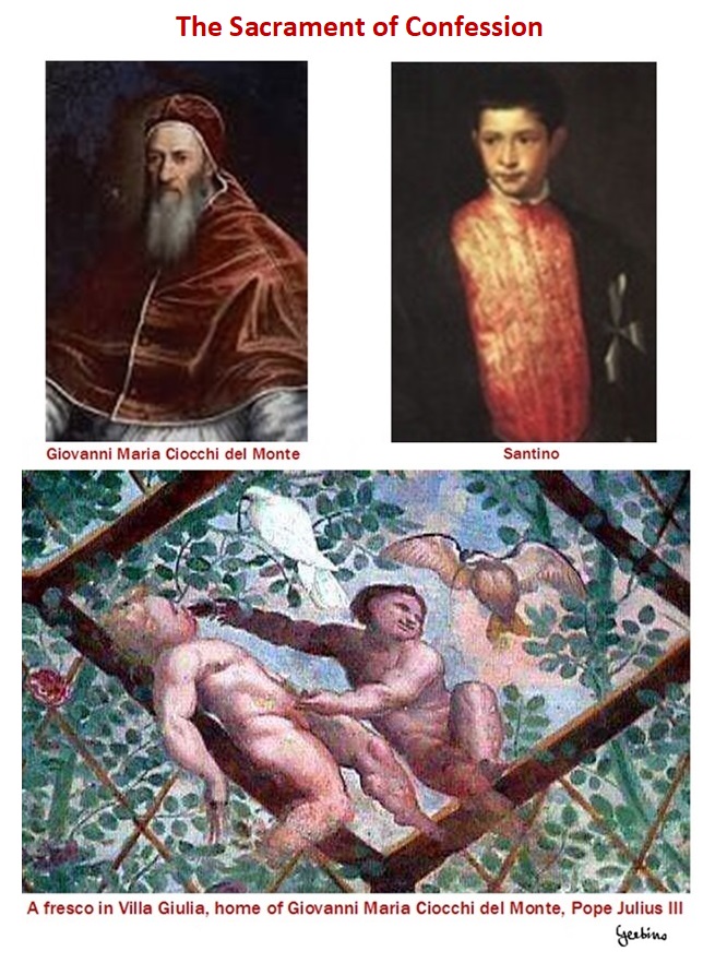 Moreover, Giovanni Maria Ciocchi del Monte was a sexually perverted individual, a sodomite. He had a long-standing sexual relationship with Santino, the son of one of his servants. This romance began when the boy was thirteen. At one point, the Pope asked his brother Balduino to adopt the boy in order to give him the name Innocenzo del Monte. The Pope made the boy a cardinal when the boy was seventeen.
