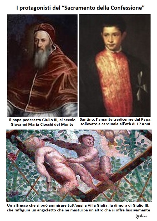 Né a giustificare la pratica della Confessione il Vaticano può asserire che questa è parte inalienabile del patrimonio della fede cristiana, perché istituita dallo stesso Gesù, o da qualcuno dei suoi discepoli, o da qualcuno dei padri della Chiesa. No, il Vaticano non può, perché il "Sacramento della Confessione" fu istituito ai tempi dell'Inquisizione, e precisamente nell'anno 1501, da Giovanni Maria Ciocchi del Monte. Costui, che da papa assunse il nome Giulio III, oltre a essere inquisitore, e dunque torturatore e assassino, fu anche un depravato sessuale. Ebbe un rapporto di sodomia con Santino, un tredicenne, figlio di un suo servitore, che poi fece adottare da suo fratello Balduino col nome di Innocenzo del Monte e ordinò cardinale quando il giovinetto aveva diciassette anni.